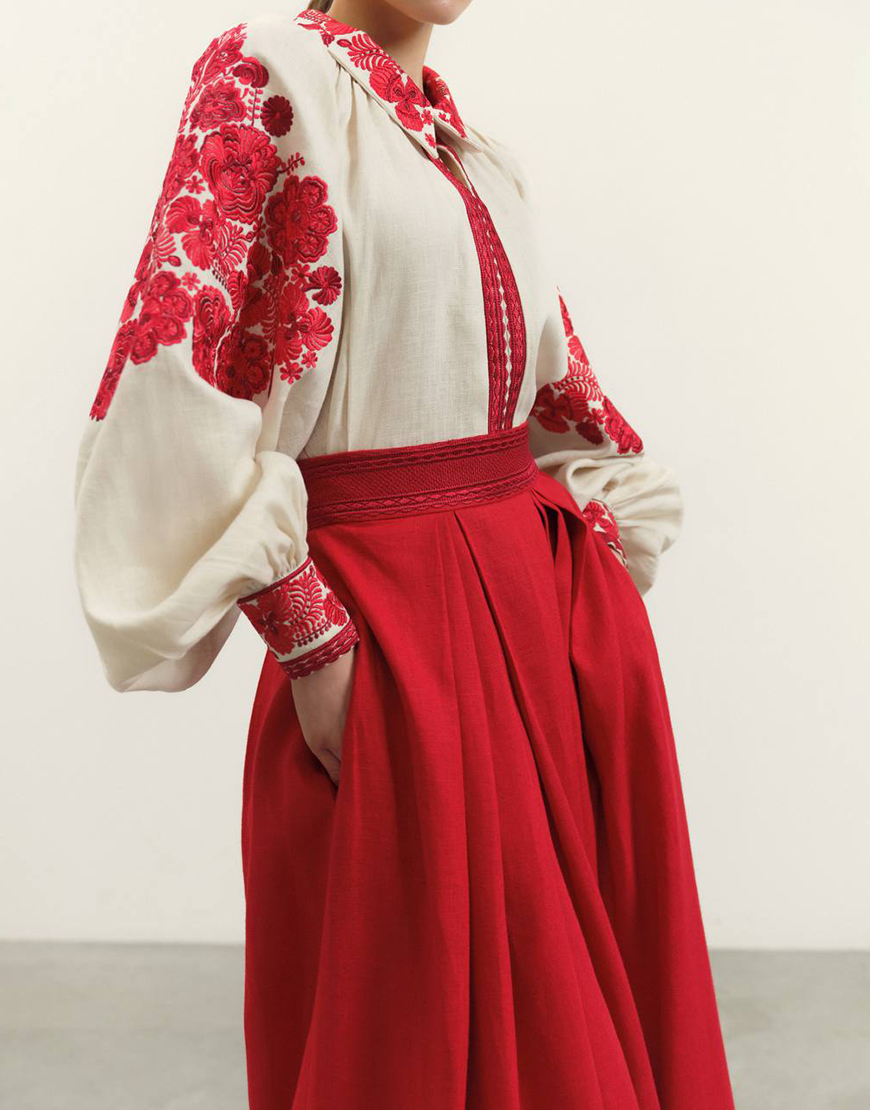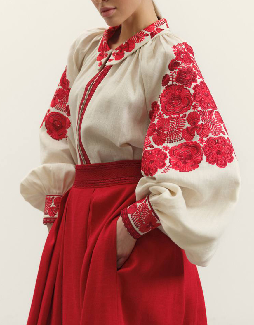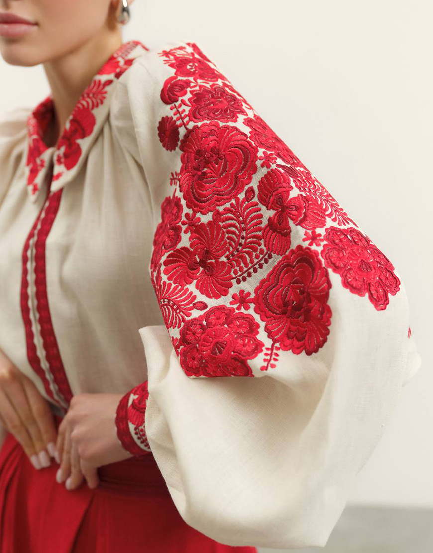 Лляна блуза, оздоблена червоно- бордовими квітковими мотивами вишивки, натхненними взорами яворівського регіону Львівщини.Спереду по всій довжині блуза зашпиляється на металеві приховані кнопочки, у блузі комірець оздоблений вишивкою.