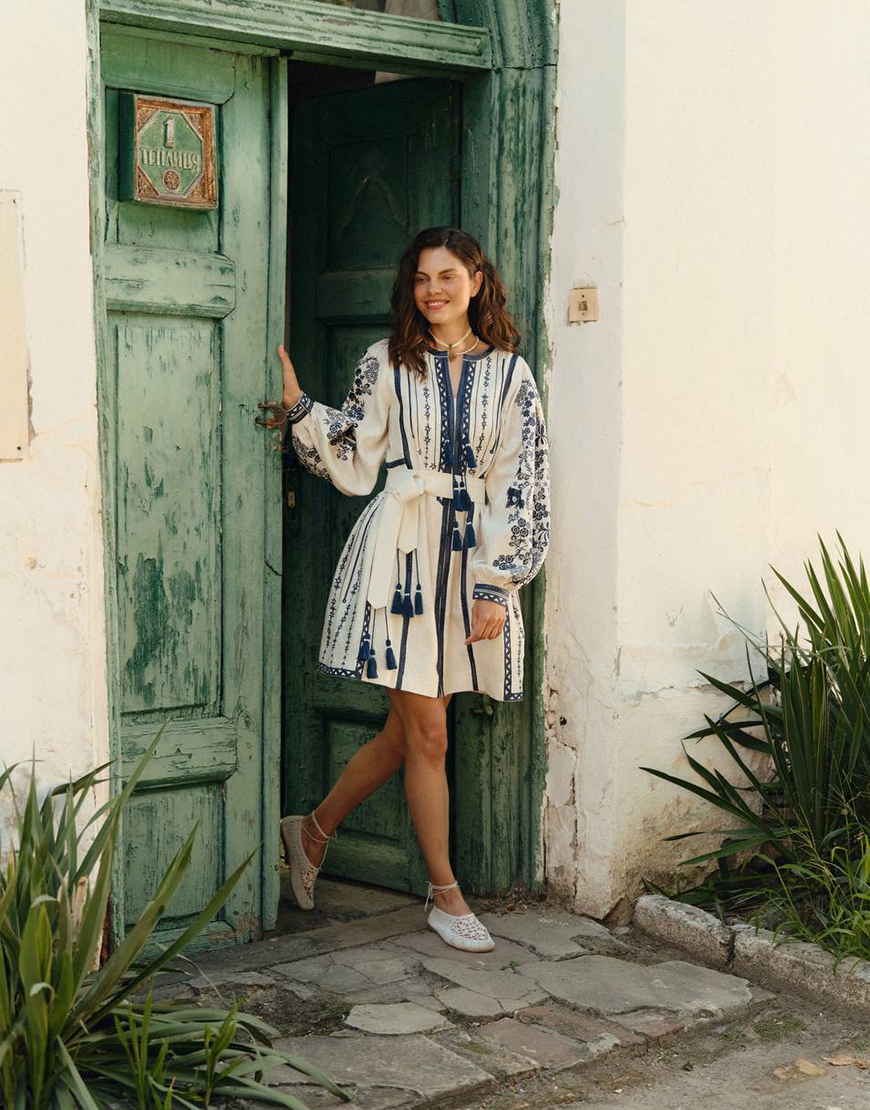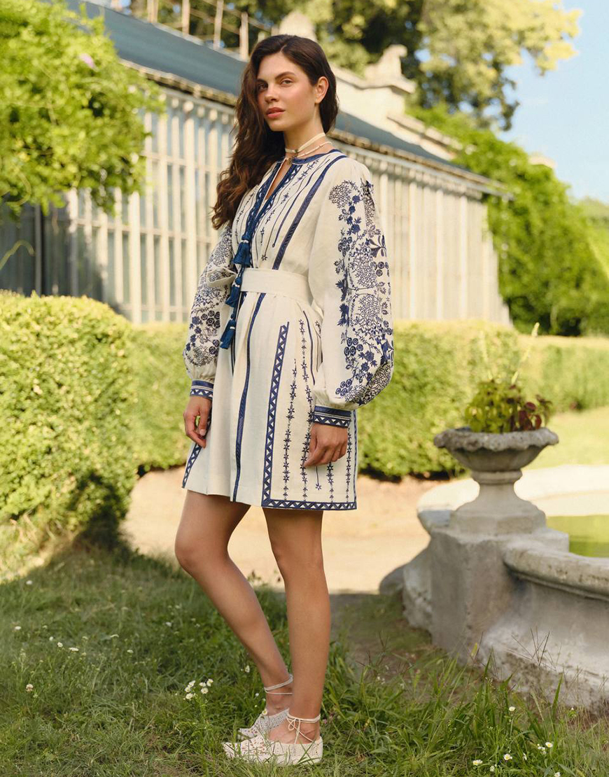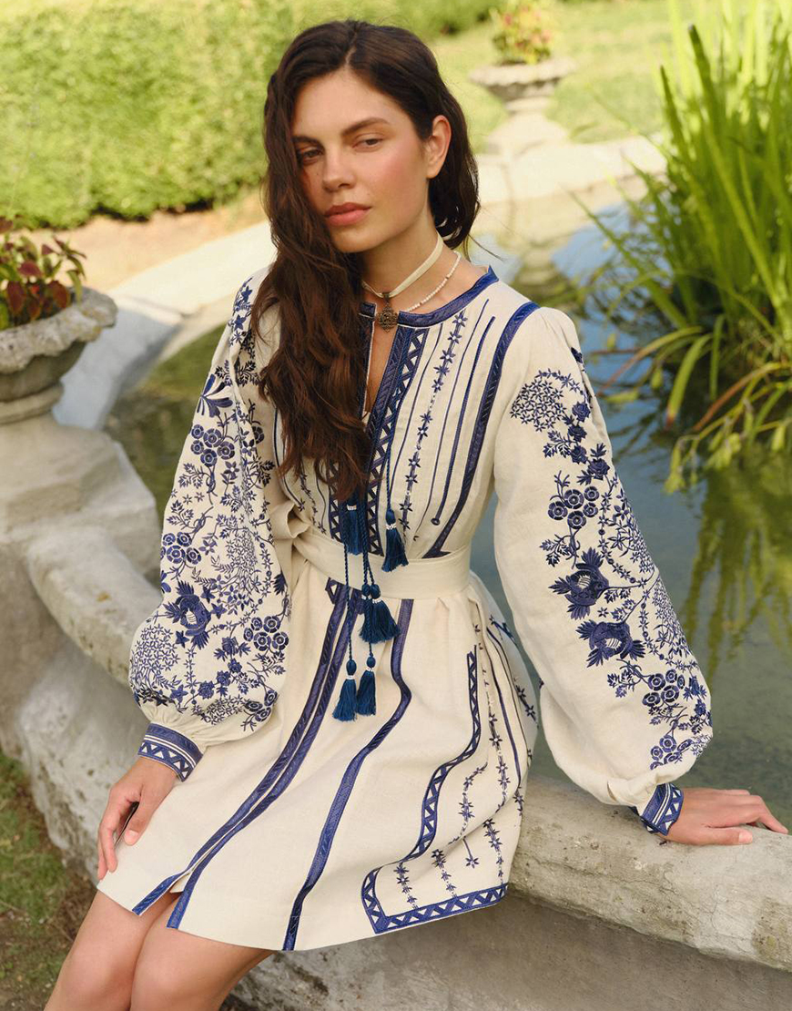 Сукня оздоблена квітковою вишвикою на рукавах, натхненною квітковим різнобарв’ям лугів та степів України.Спереду сукня зашпиляється з допомогою металевих кнопочок. Оздоби виробу додають численні китиці. Пояс в комплекті.
