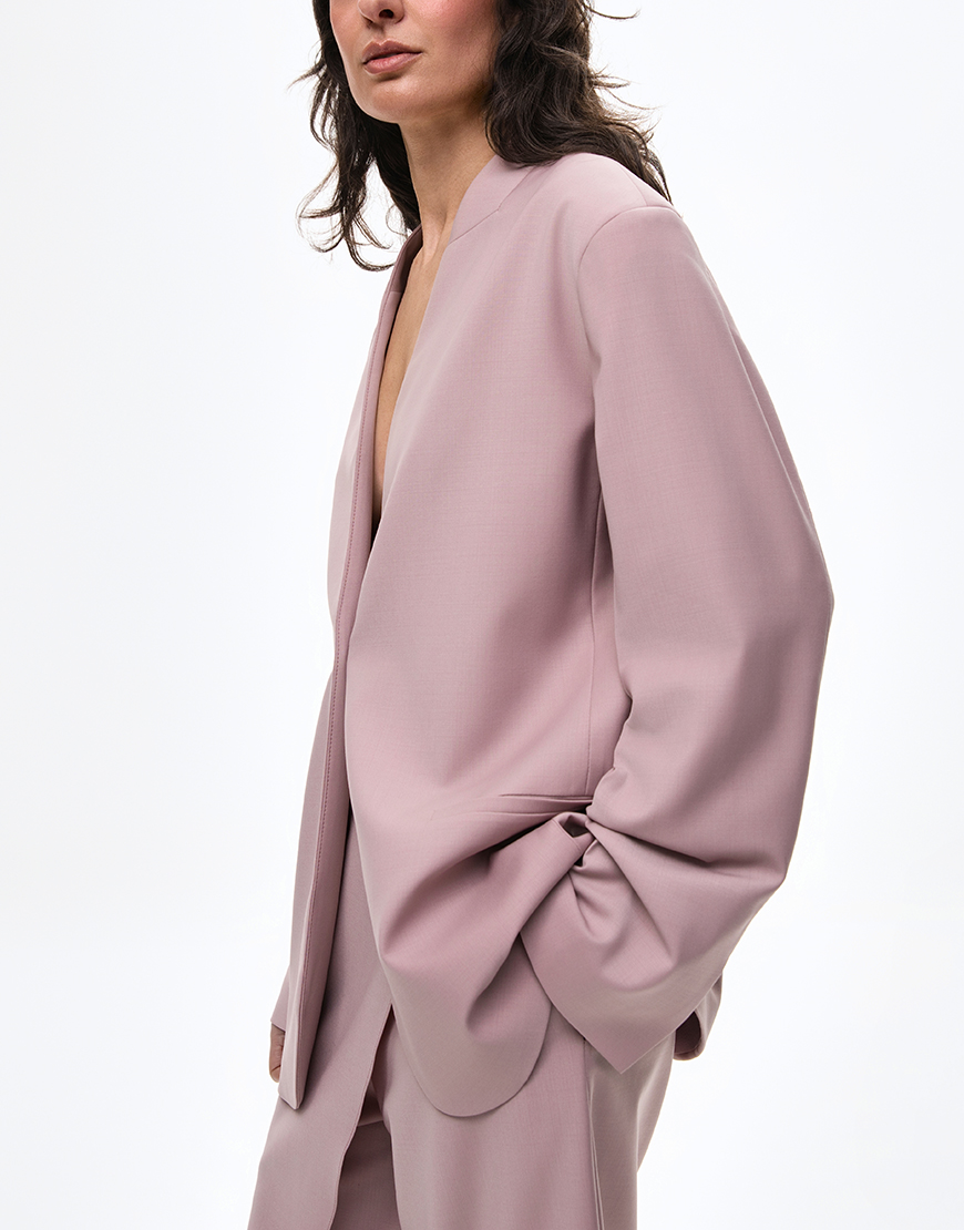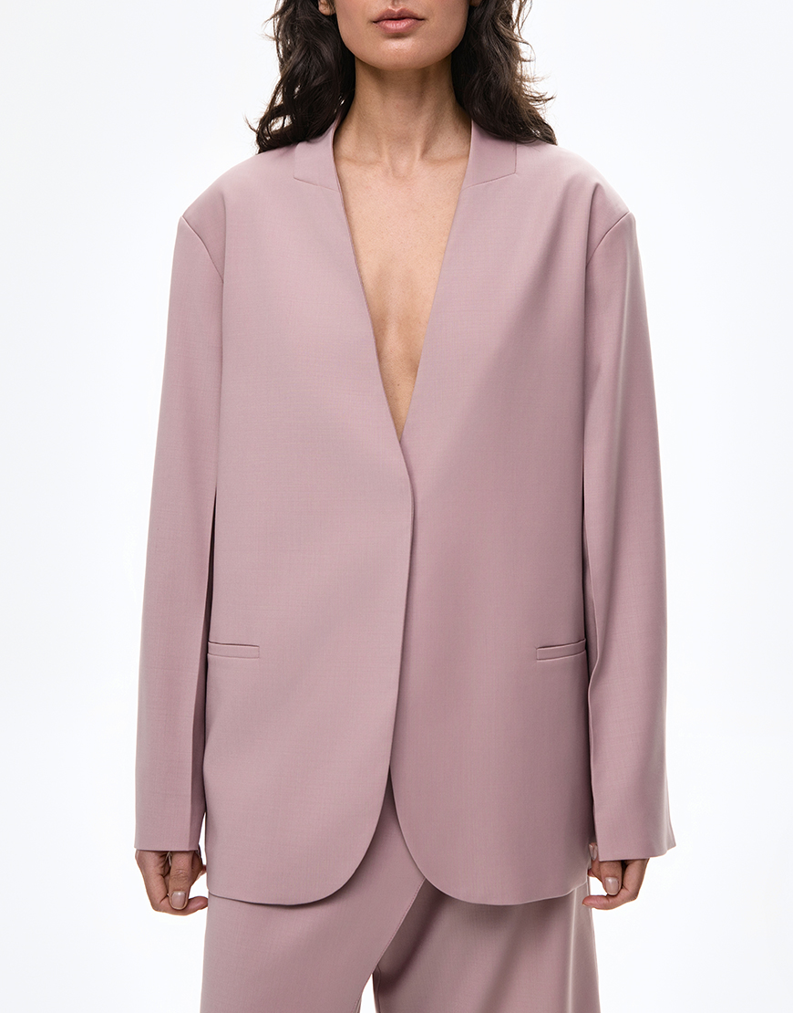 Доставка впродовж 5-7 робочих днівРожевий жакет прямого силуету з матової костюмної тканини з ледь відчутною текстурою. Має чисту лінію плеча, глибокий виріз і приховану застібку — все для витонченого, але функціонального образу. Можна носити як костюм із бермудами або окремо — з денімом, спідницями чи поверх сукні.