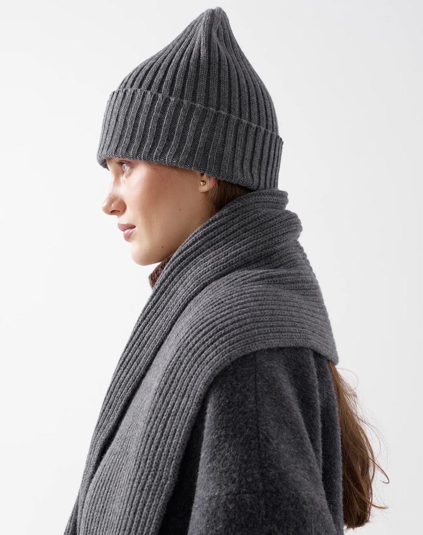 В’язаний сірий шарф з ніжної вовни та кашеміру. Оздоблений декоративним стібком ручної роботи. М’який, теплий та приємний до тіла, ідеально поєднується з сірою шапкою у тон.