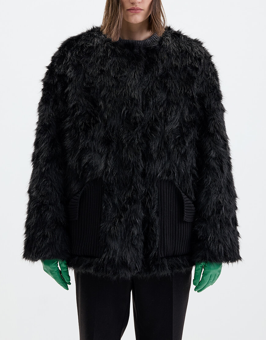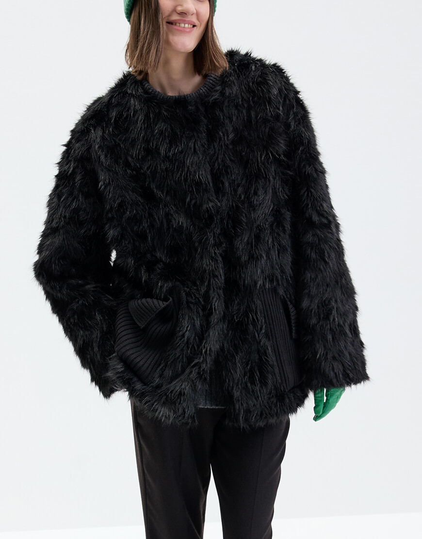 Шуба прямого крою виконана зі штучного хутра. Декорована накладними в‘язаними кишенями. Застібається на гачки.