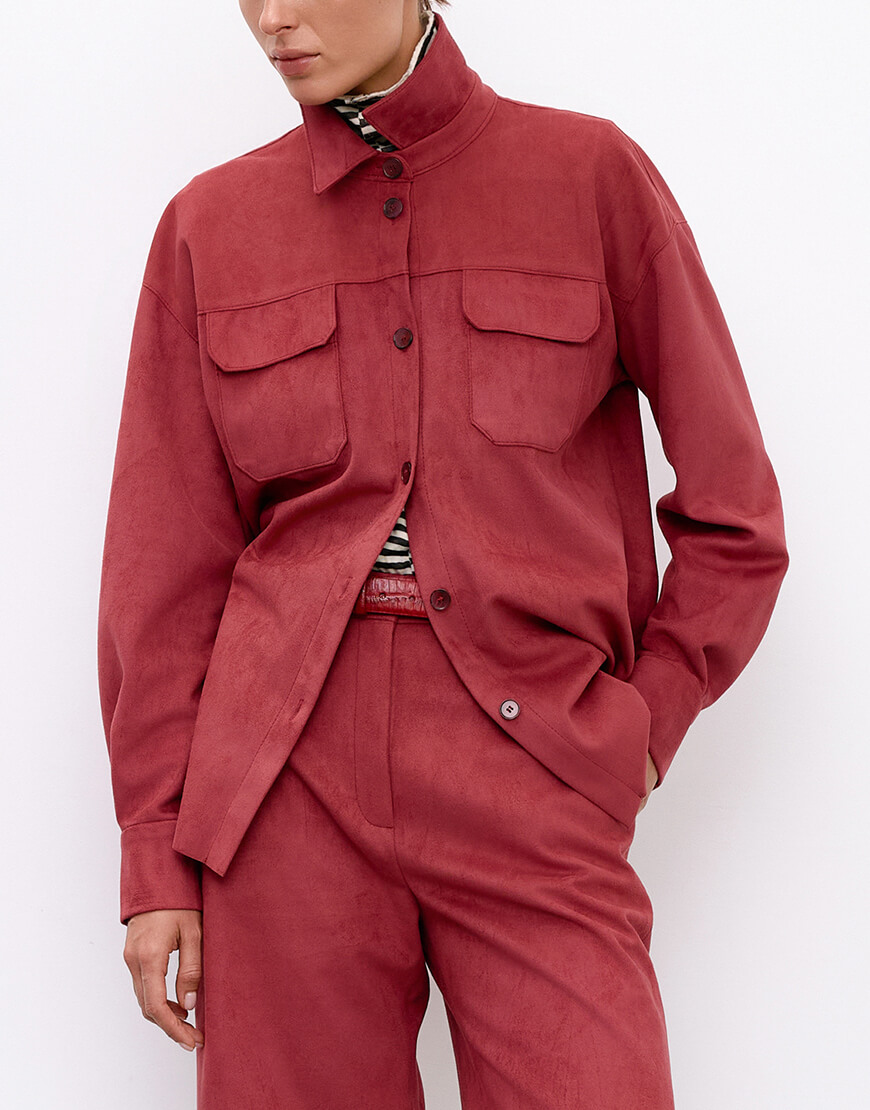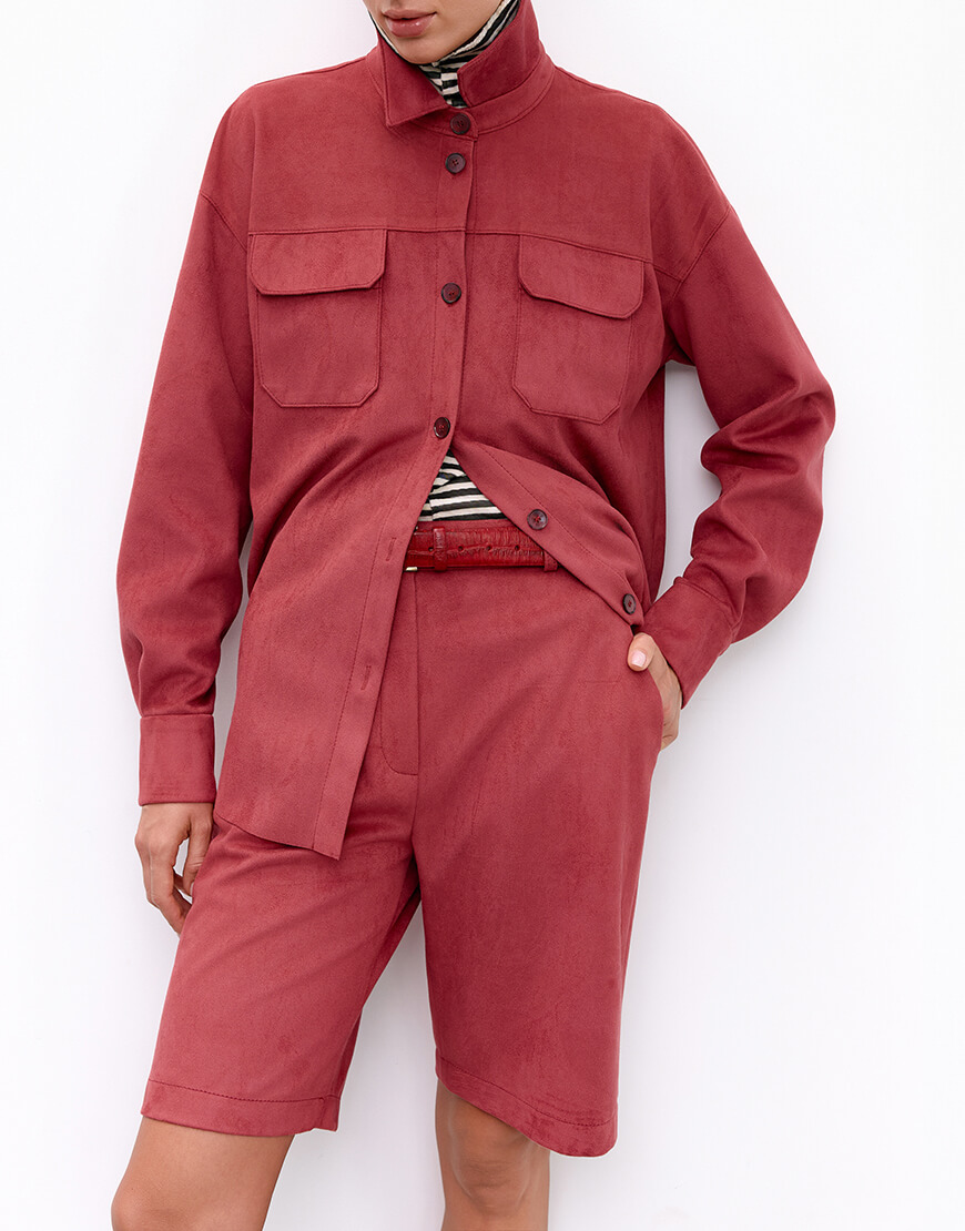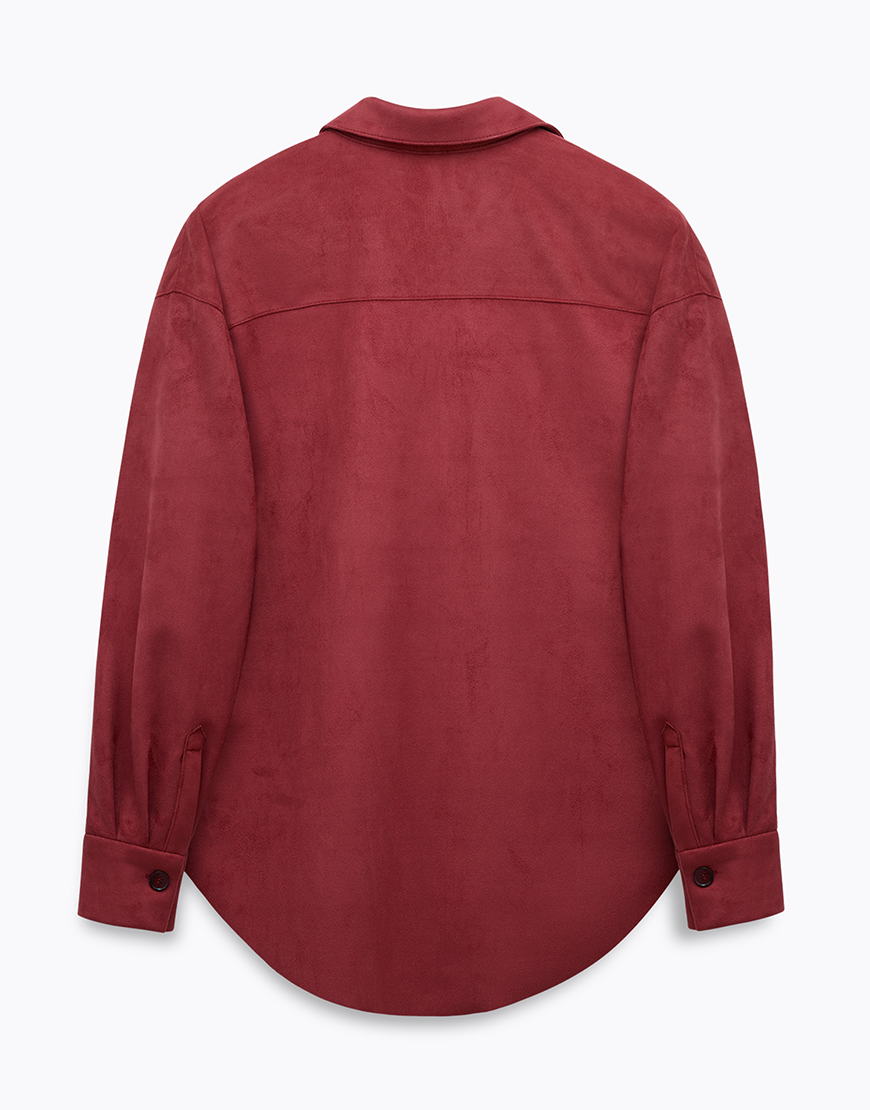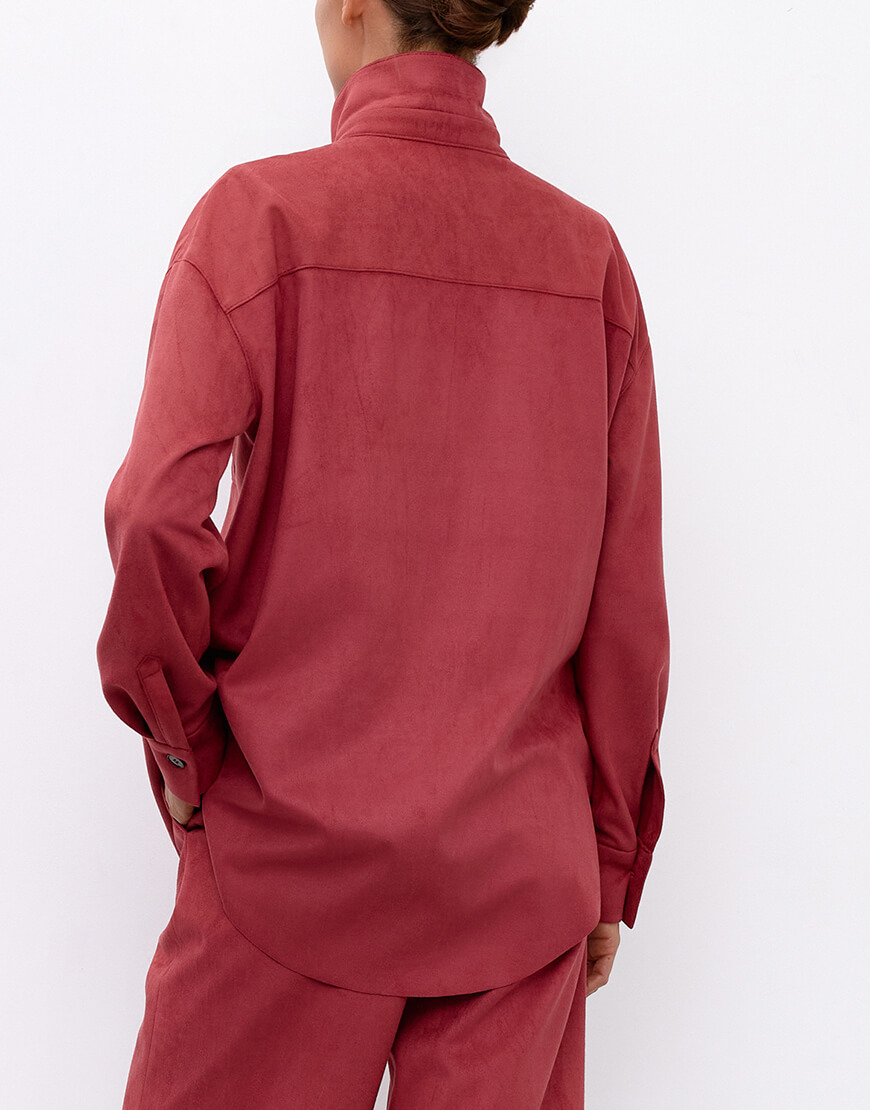Доставка впродовж 5-7 робочих днівСорочка прямого крою виконана з м‘якої екозамші. Має асиметричний низ. Застібається на ґудзики.