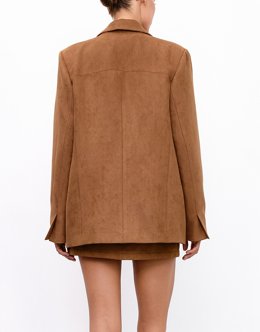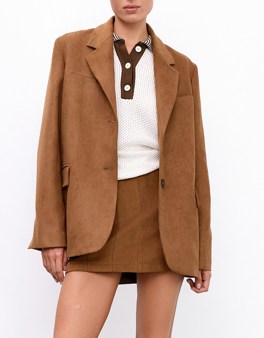 Замшевий жакет прямого крою з V-подібними лацканами. Декорований клапанами поверх двох кишень. Застібається на ґудзики.