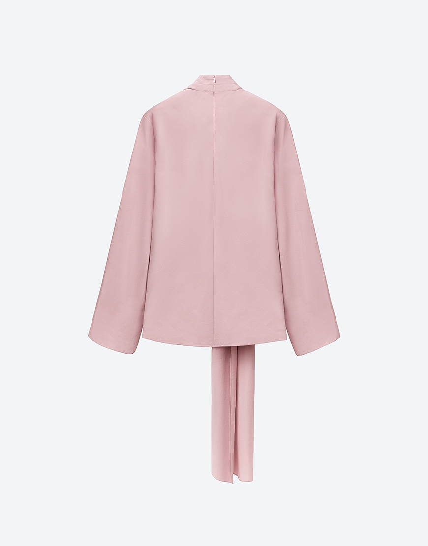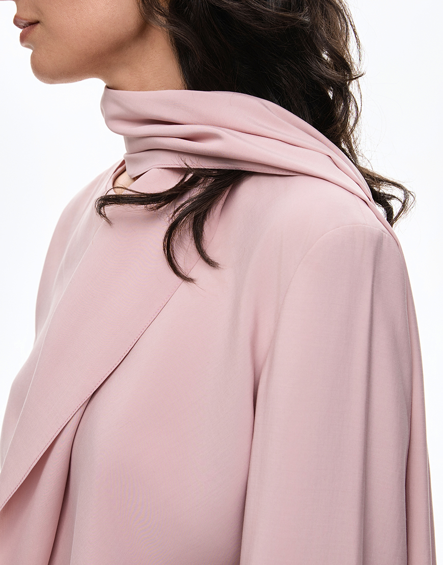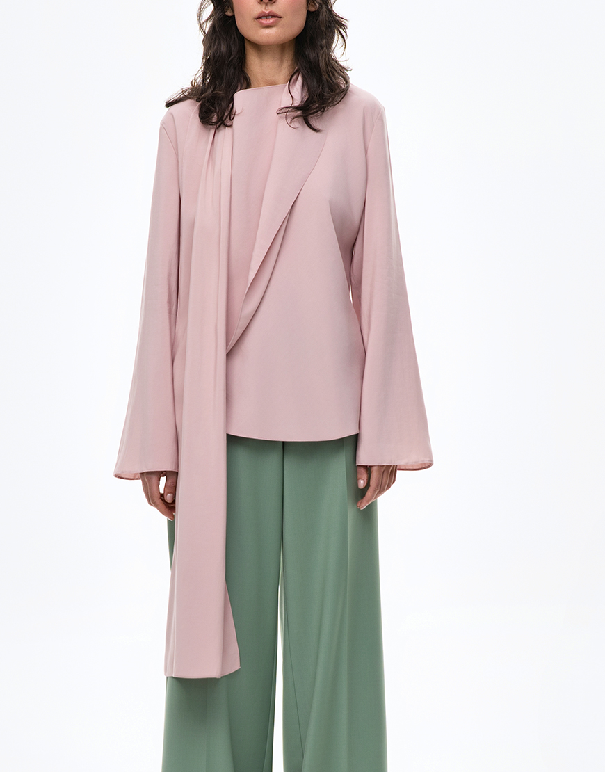 Доставка впродовж 5-7 робочих днівБлуза прямого силуету з м’якої тканини з матовим фінішем. Особливий акцент — подовжена драпірована деталь на шиї, яку можна зав’язати, обгорнути або залишити спадати вільно. Довгі рукави мають легке розширення донизу, створюючи елегантний силует у русі. Завдяки простому крою блуза поєднується як із класичними, так і з більш розслабленими речами, зокрема широкими штанами, денімом чи спідницями.