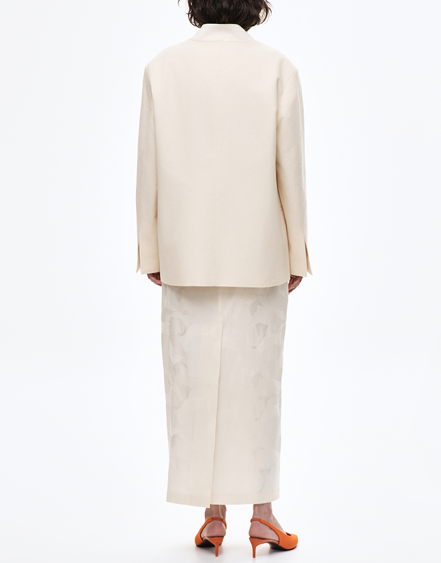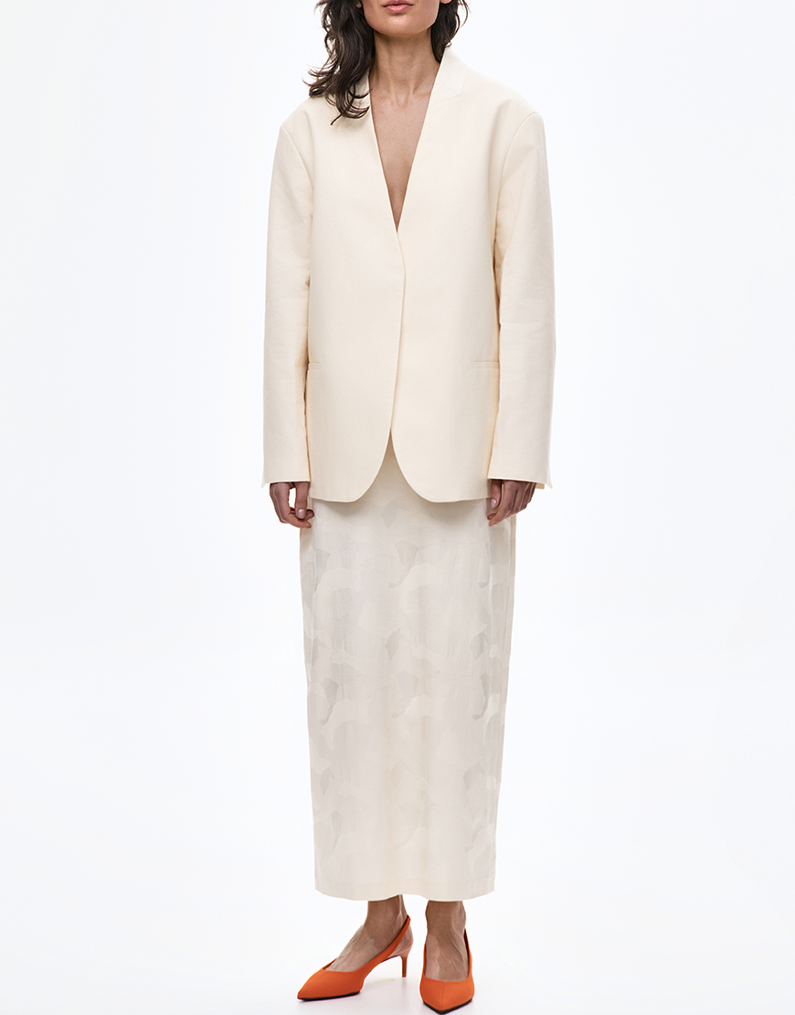 Доставка впродовж 5-7 робочих днівМолочна міді-спідниця з тонким ткацьким візерунком, що нагадує силуети квітів. Тканина щільна, проте невагома, з делікатним блиском, який м’яко переливається на світлі. Пряма лінія крою й акуратна посадка на талії створюють гармонійний силует. Носіть із жакетом для вивіреного образу або комбінуйте з базовими топами, щоб додати вишуканості повсякденним вбранням.