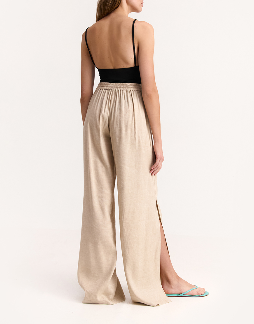 Доставка впродовж 5-7 робочих днівБежеві лляні штани вільного крою з розрізами внизу. Пояс на еластичній гумці для зручної посадки. Декоративний шнурок оздоблений намистинами з переробленого пластику у відтінках бірюзи та карамелі. Виконані з легкої та натуральної тканини, що ідеально підходить для спекотних днів.