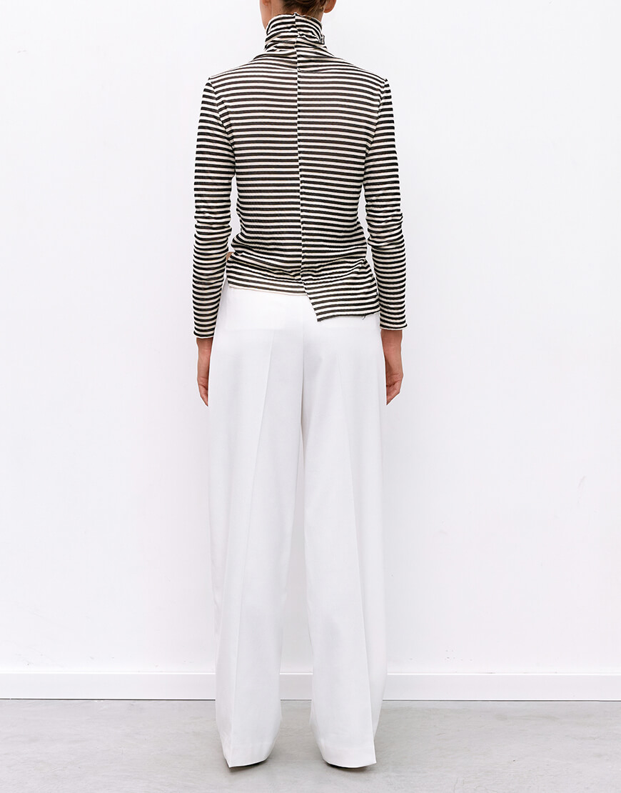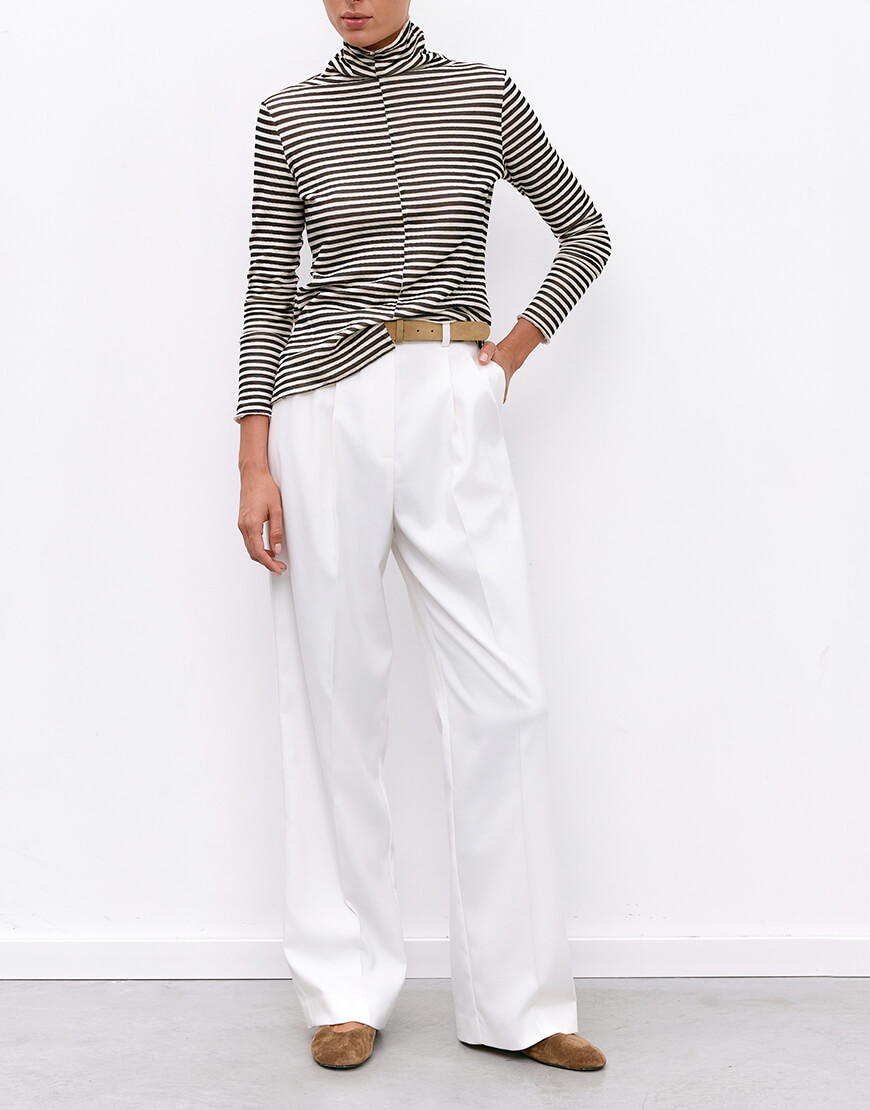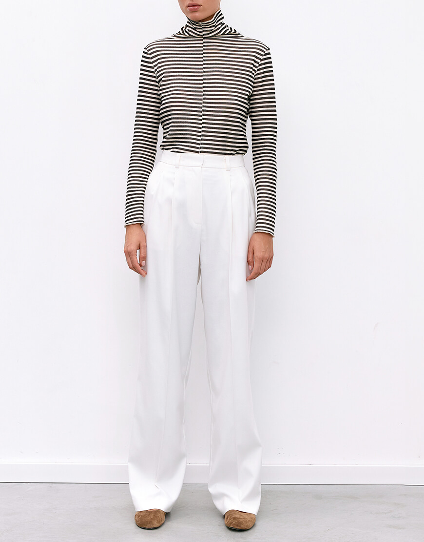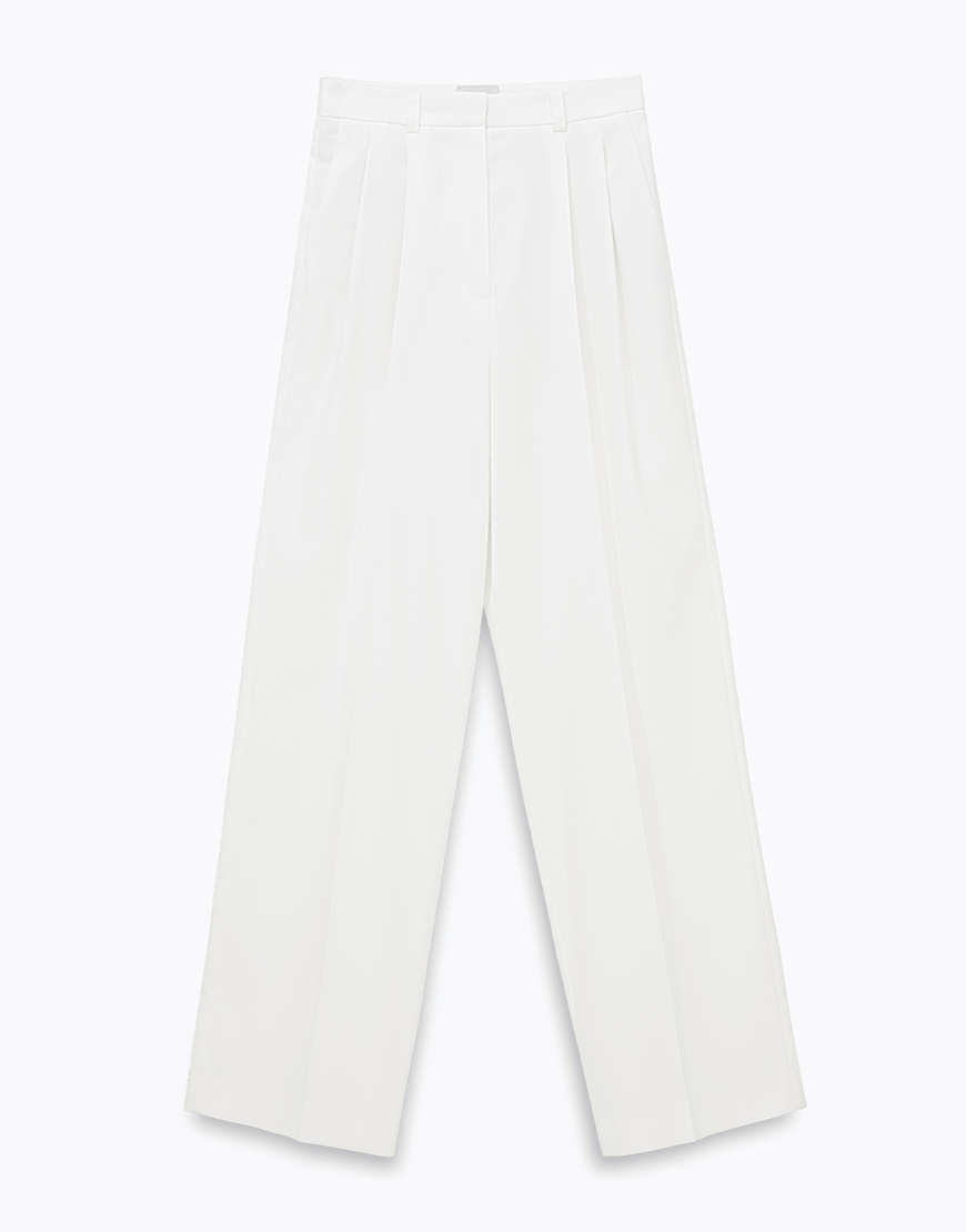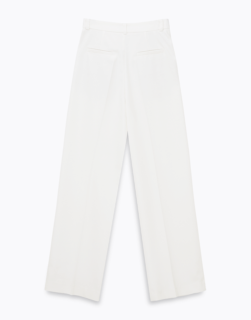 Класичні штани прямого крою з защіпками. Оздоблені двома прорізними кишенями. Застібаються на замок і гачки.