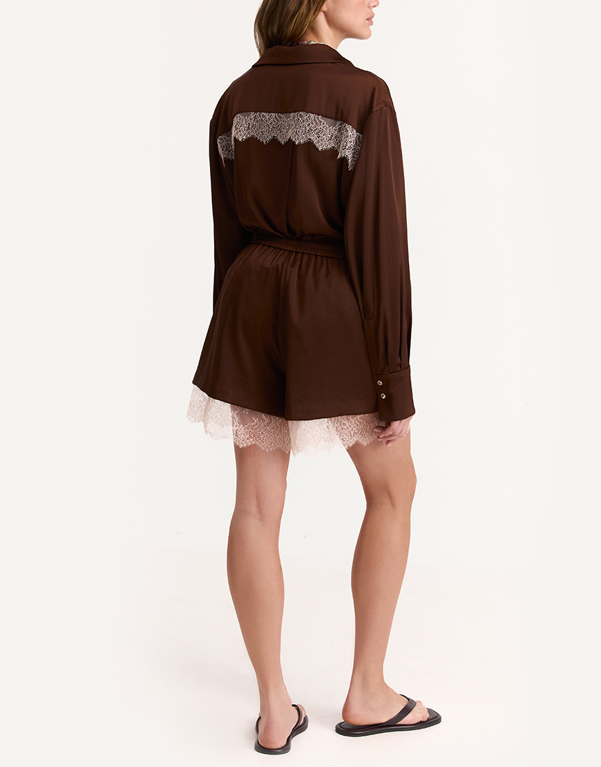 Доставка впродовж 5-7 робочих днівШорти з м’якого сатину з делікатною мереживною обробкою по краю. Вільний крій, комфортна посадка, пояс на еластичній гумці шириною 3 см. Мають зручні кишені. Мереживо ніжно-бежевого відтінку виступає з-під основної тканини, створюючи м’який контраст. Доступні у двох кольорах: теплий молочний і глибокий шоколадний — у комплект до відповідної сорочки.