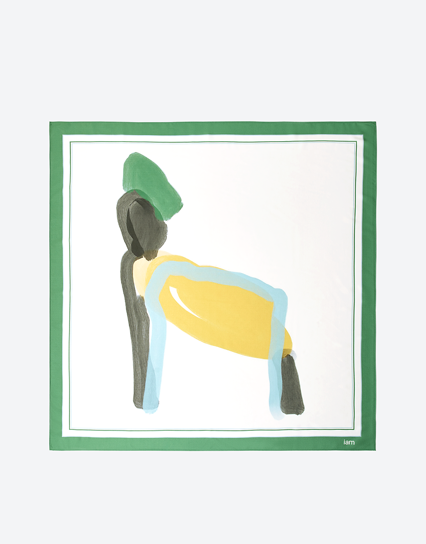 Шовкова хустка з абстрактним принтом у пастельних тонах – зеленої, кремової, блакитної та жовтої гами. Її можна носити як аксесуар або повноцінну частину образу: на талії, на плечах чи як топ. Універсальна річ, що додає кольору, м’якості й акценту у щоденний гардероб. Ілюстрацію розроблено – Courier Creative Studio.
