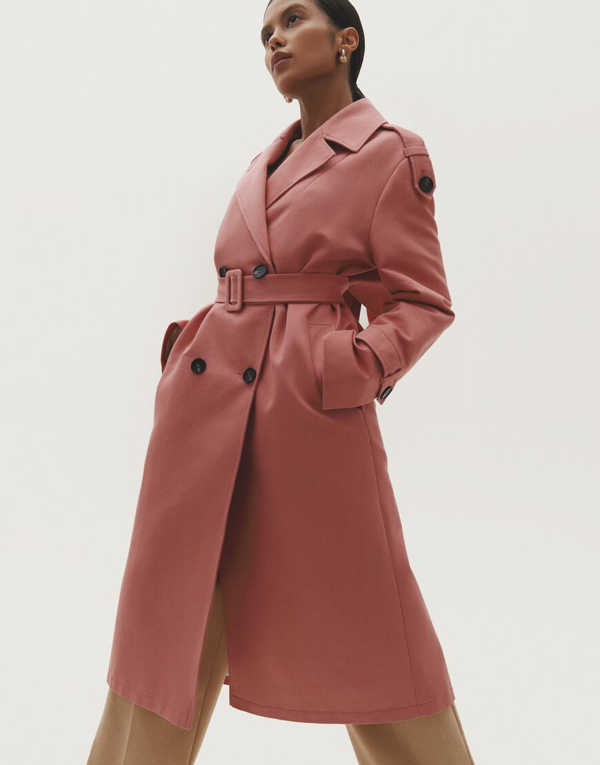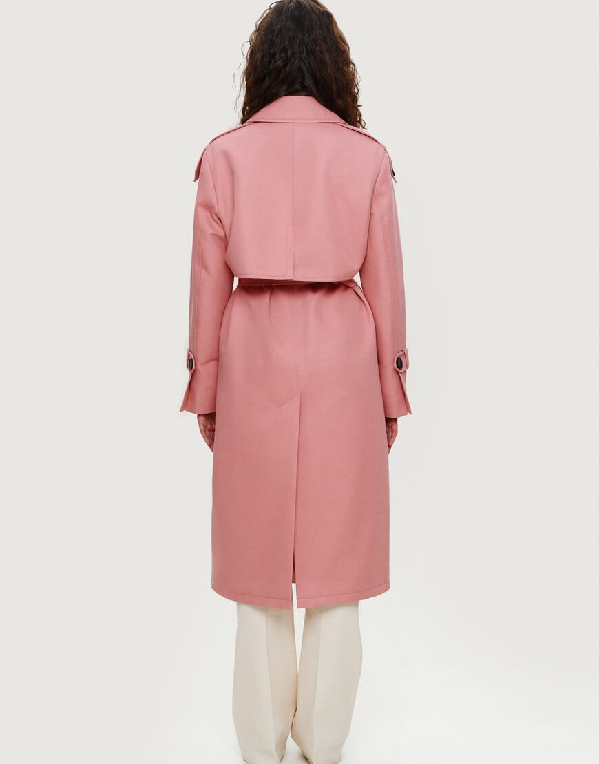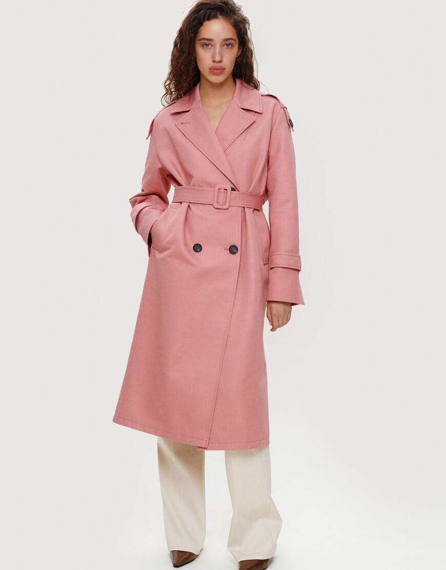 Тренч довжини міді, оздоблений поясом з пряжкою та зав‘язками на рукавах. Має комір з V-подібними лацканами та дві прорізні кишені по боках.