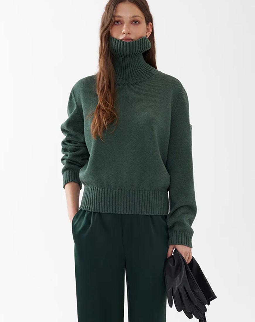 Доставка впродовж 5-7 робочих днівМ’який вовняний светр з кашеміром у зеленому відтінку, прикрашений ручними стібками на плечовій кишеньці та спині, що підкреслює індивідуальність кожного виробу.