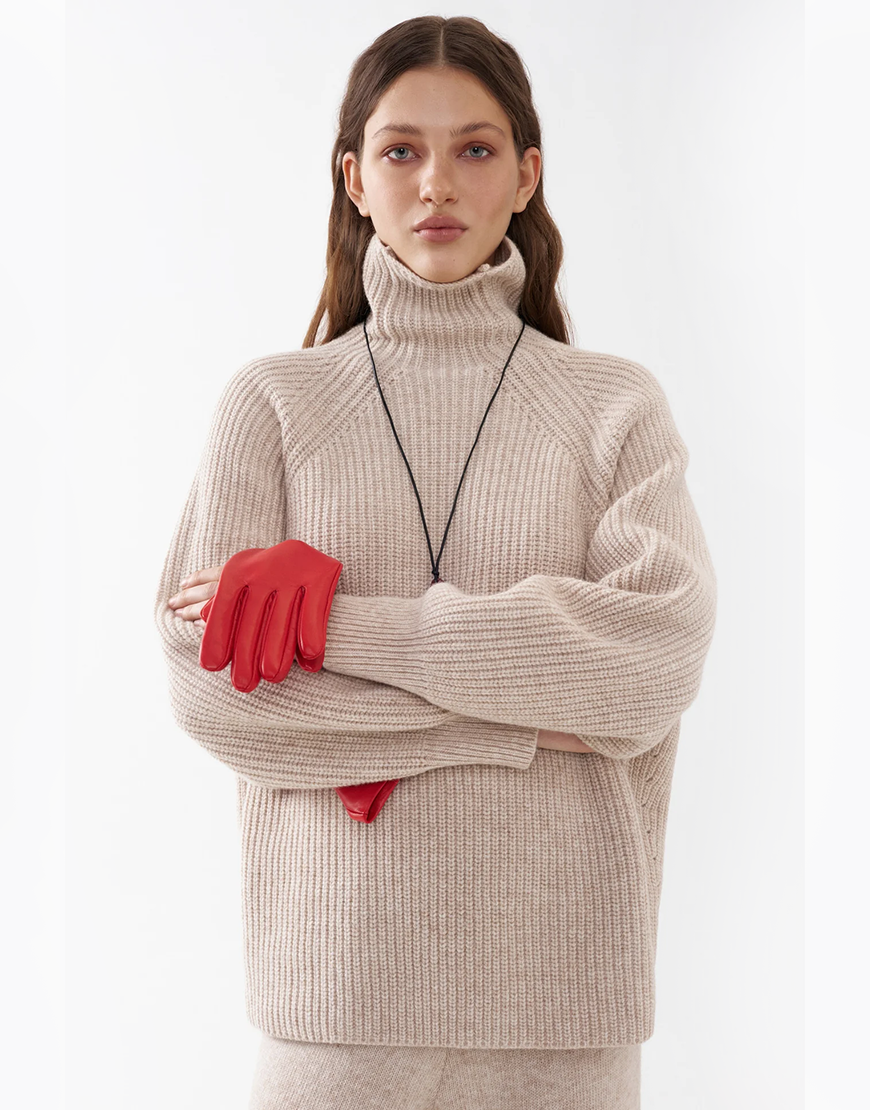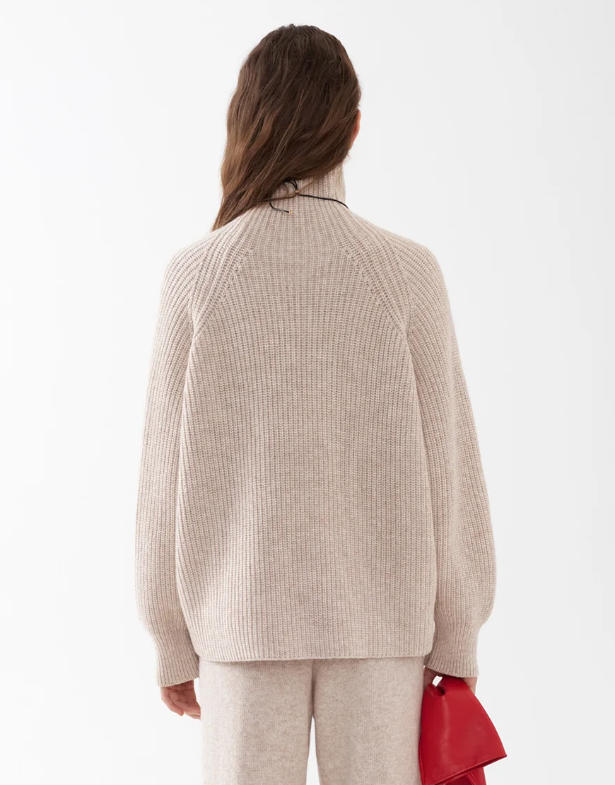 Доставка впродовж 5-7 робочих днівТеплий оверсайз светр грубої в’язки із високою горловиною, виконаний із мериносової вовни з додаванням кашеміру. Добре тримає тепло та форму, забезпечує комфорт під час носіння. Легко поєднується із штанами в тон, а також з верхнім одягом, шарфами, шапками та балаклавами, додаючи образу затишку й стилю.