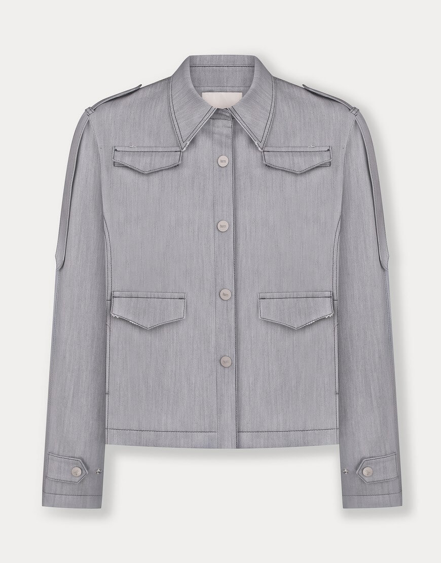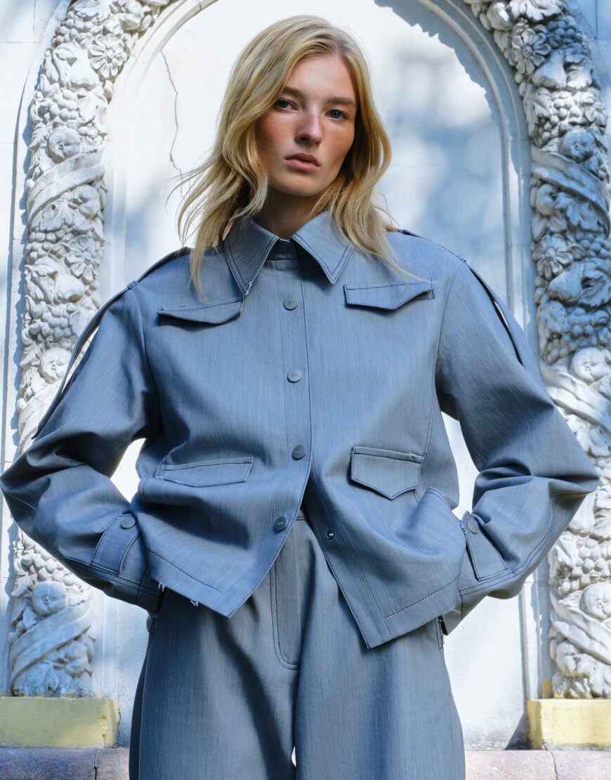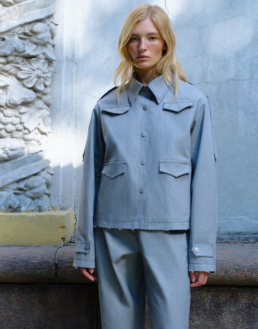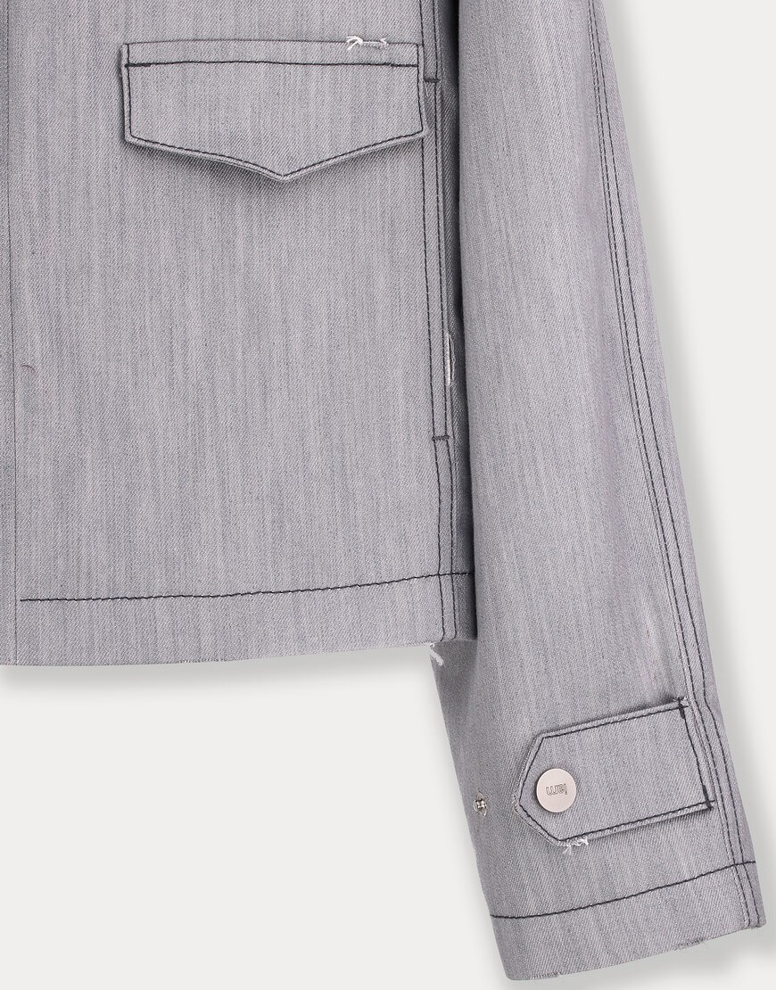 Джинсова куртка прямого крою з декоративними клапанами, виконана з котону. Оздоблена хлястиками на плечах та рукавах.