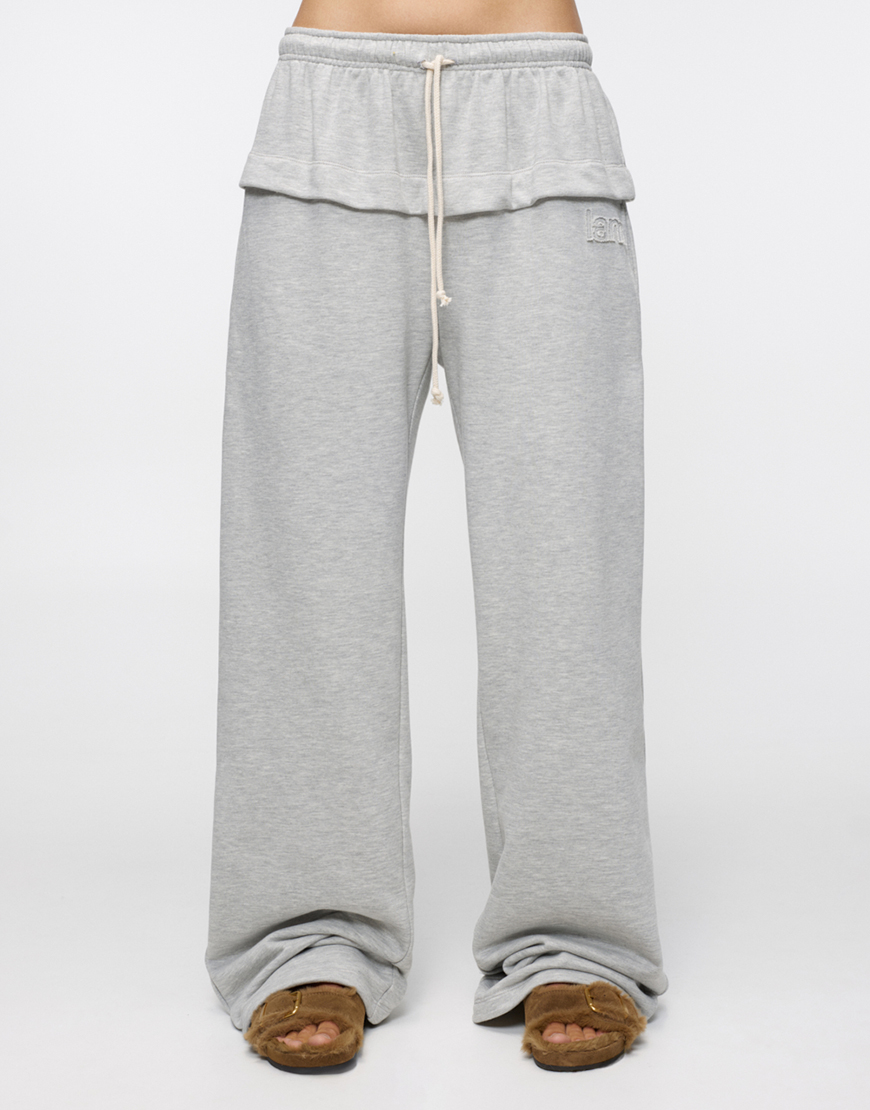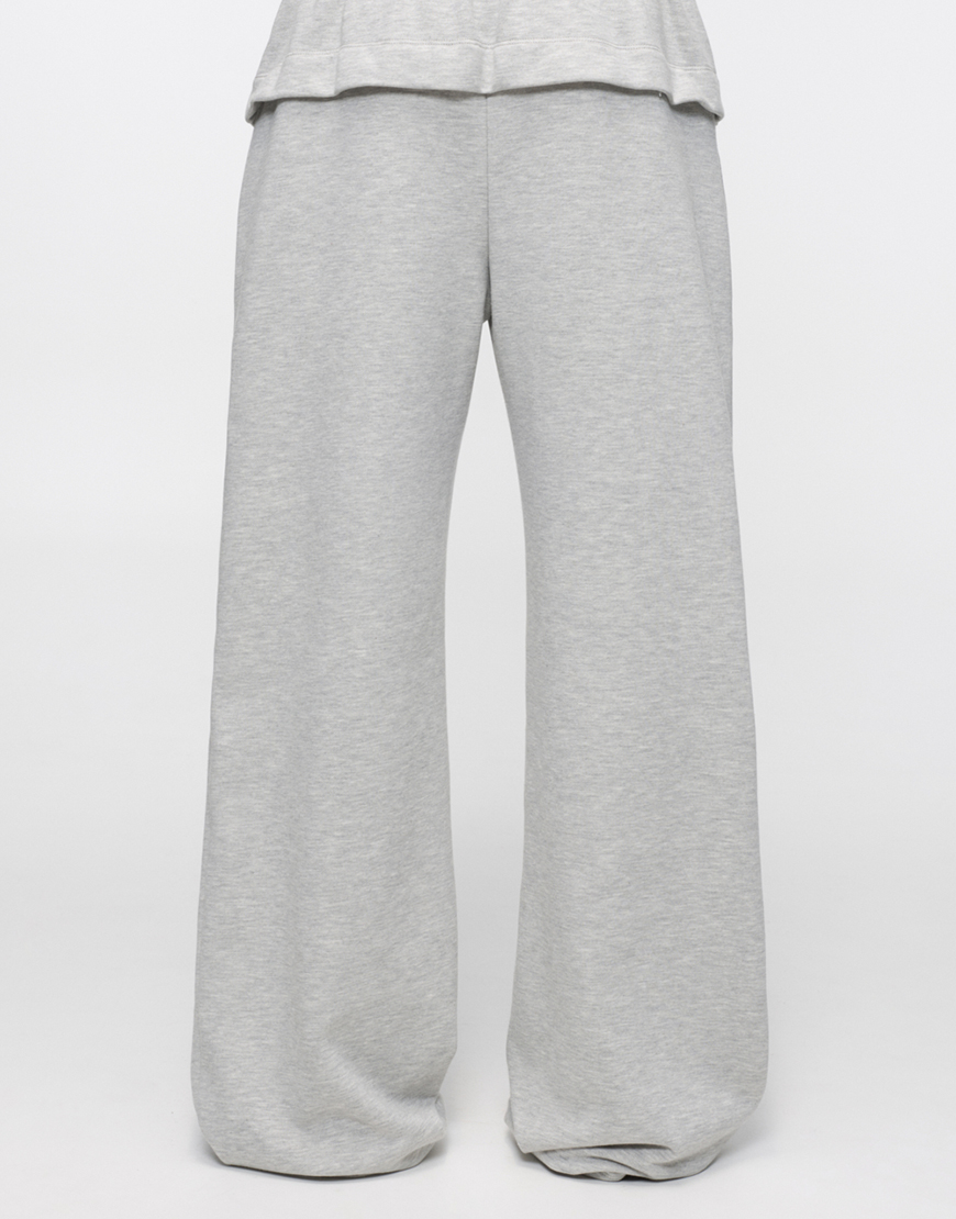 Доставка впродовж 5-7 робочих днівКомфортні штани вільного крою світло-сірого кольору з декоративним поясом-воланом. Пояс на резинці з молочним бавовняним шнурком, доповнені фірмовим логотипом. Затишна модель для повсякденного носіння та відпочинку.
