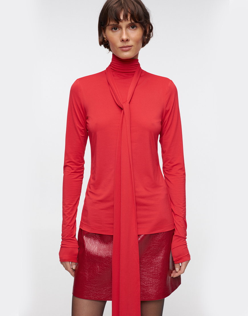 Доставка впродовж 5-7 робочих днівСтильний гольф яскраво червоного кольору з асиметричним шлейфом на горловині. Оздоблений декоративним вирізом у верхній частині спини. Ідеальна акцентна модель для урізноманітнення осінніх образів.