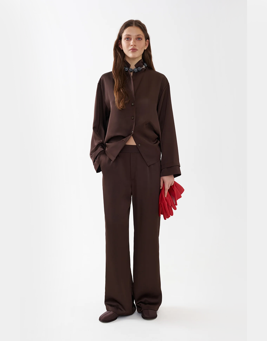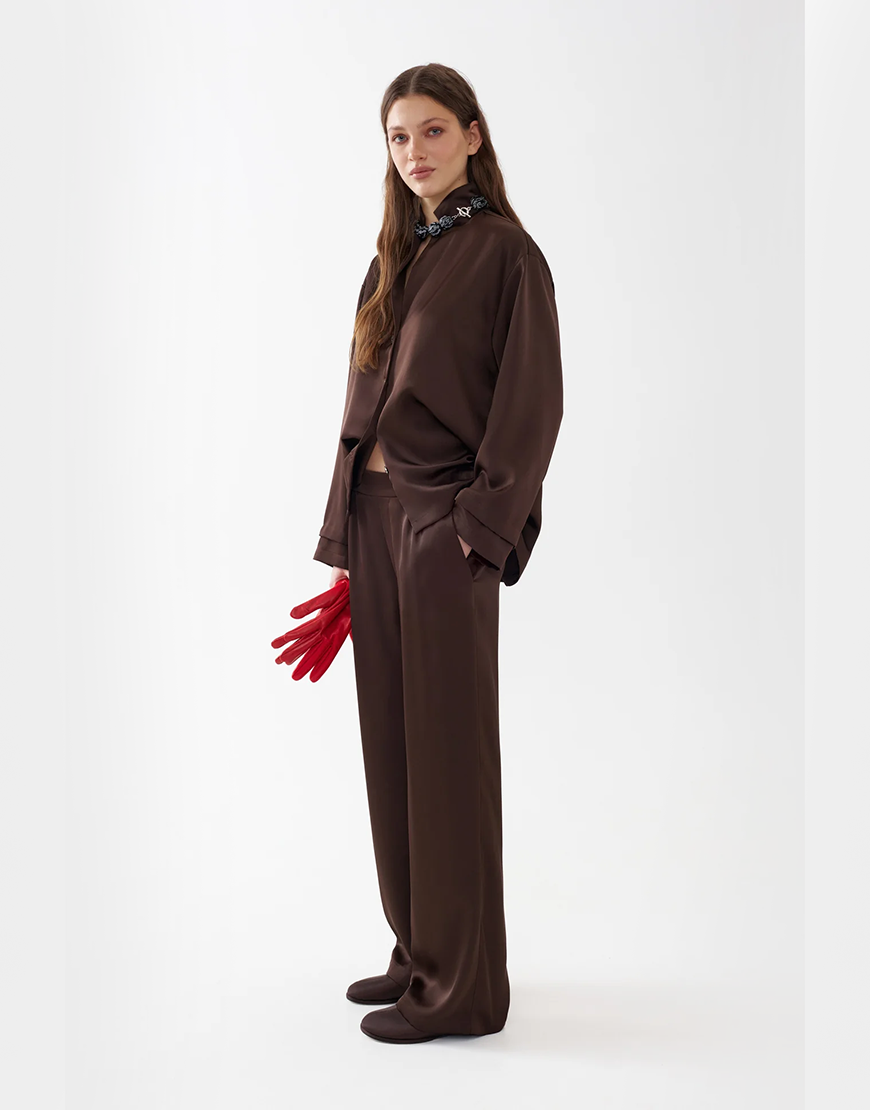 Доставка впродовж 5-7 робочих днівСатинові штани з м’якої віскози в коричневому кольорі. Ніжна тканина на дотик створює комфорт та делікатне ковзання по шкірі.У комплекті із сатиновою сорочкою вигляд стає завершеним і може бути як повсякденним, так і святковим.