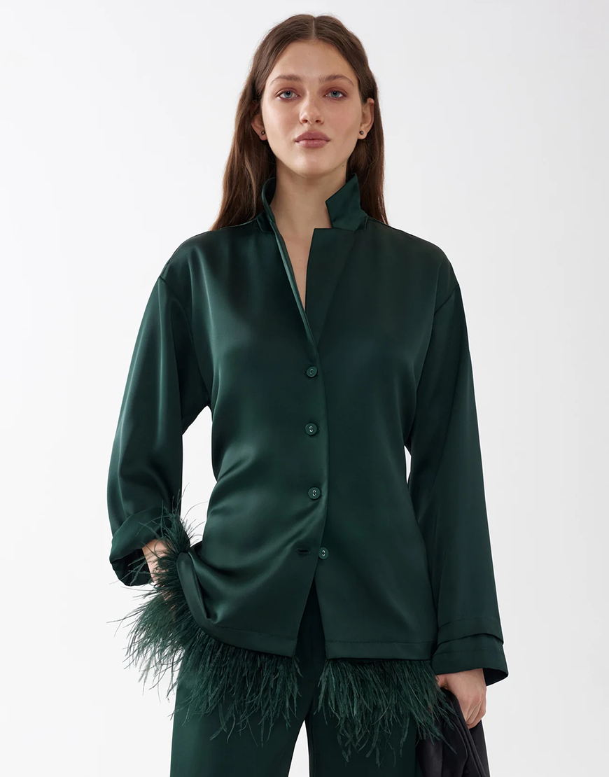 Доставка впродовж 5-7 робочих днівСатинова сорочка з м’якої віскози у глибокому зеленому кольорі, прикрашена натуральним страусиним пір’ям по краю. Пір’я кріпиться на гудзики, тож його легко знімати та доглядати. Ніжна на дотик тканина створює комфорт та делікатне відчуття ковзання по шкірі.