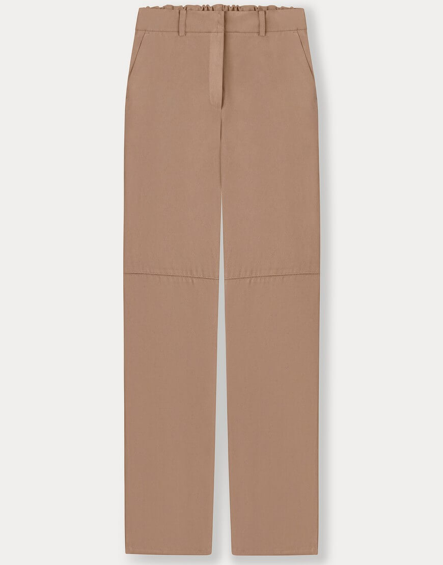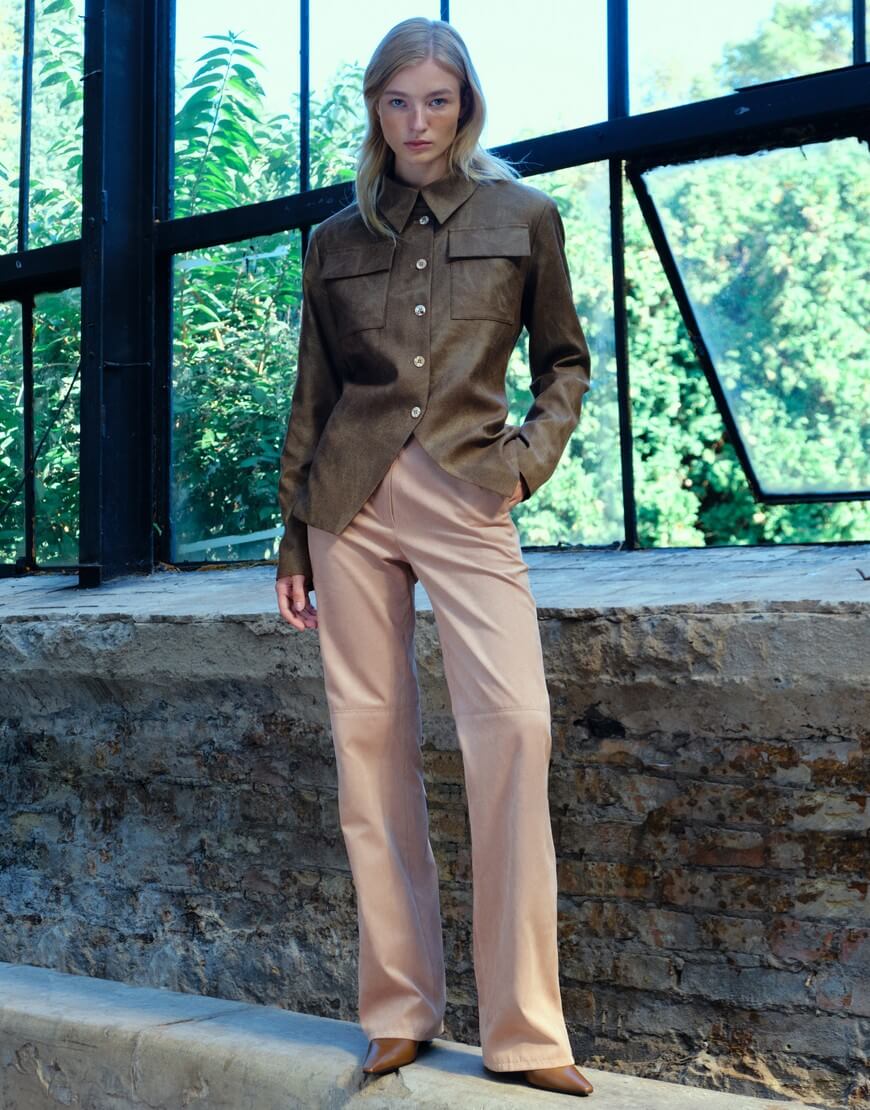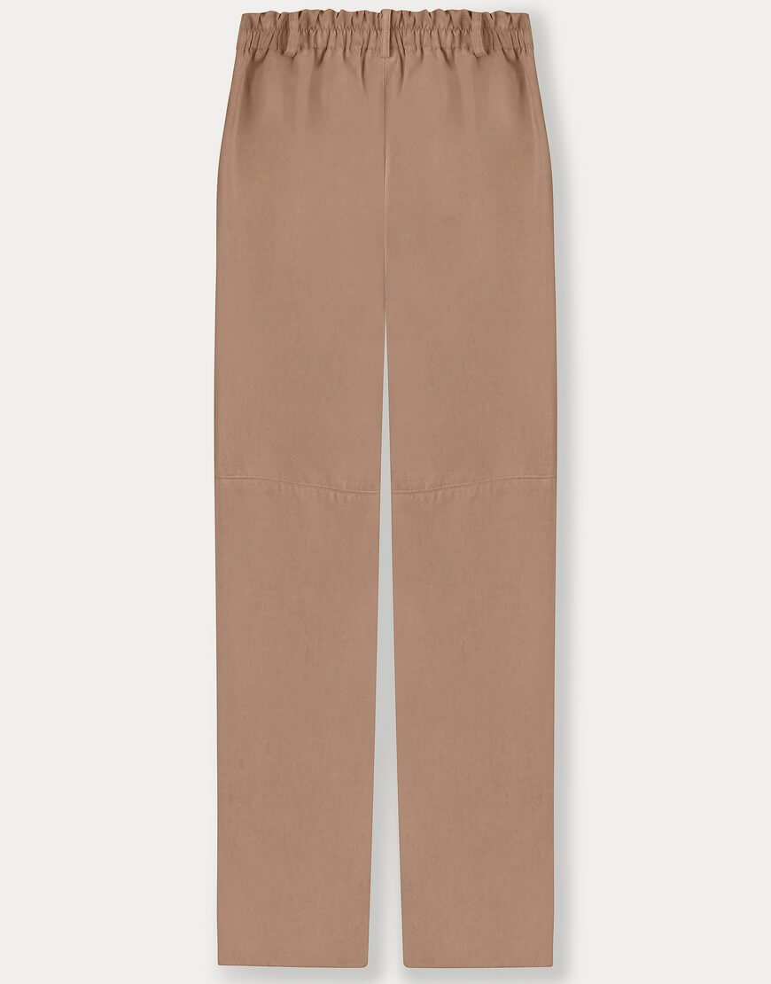 Замшеві штани прямого крою з середньою посадкою, оздоблені двома кишенями спереду. Застібаються на замок та приховані защипи на талії.