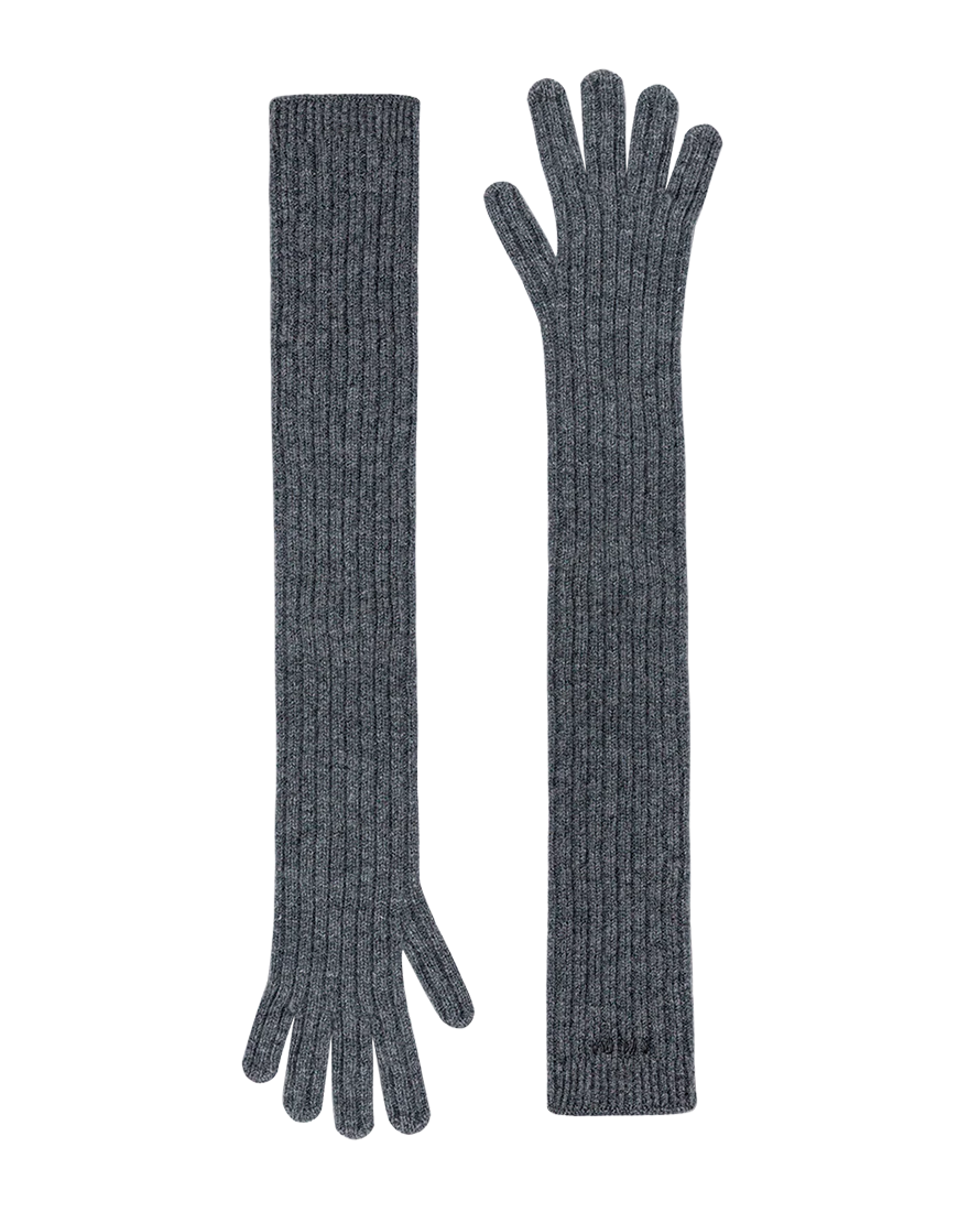 Доставка впродовж 5-7 робочих днівДовгі в’язані рукавиці в сірому кольорі з ніжної вовни, прикрашені стібком ручної роботи, що робить кожну пару унікальною та особливою.
