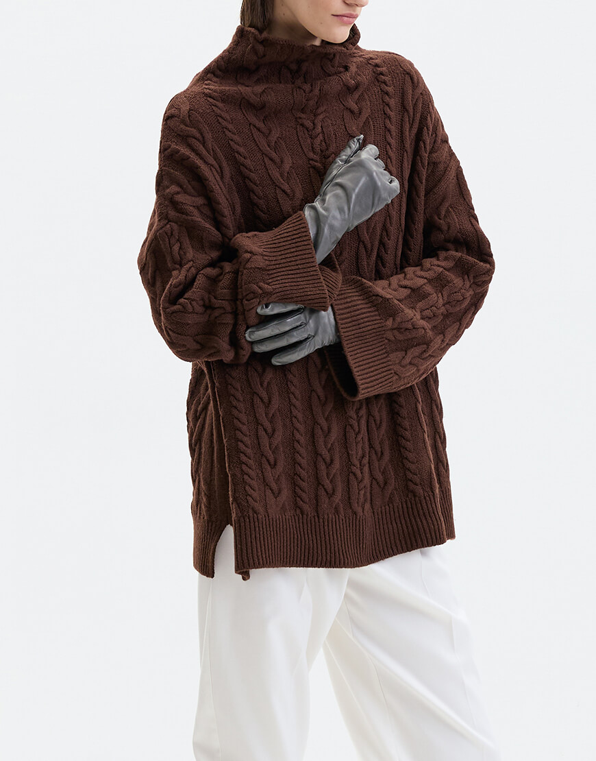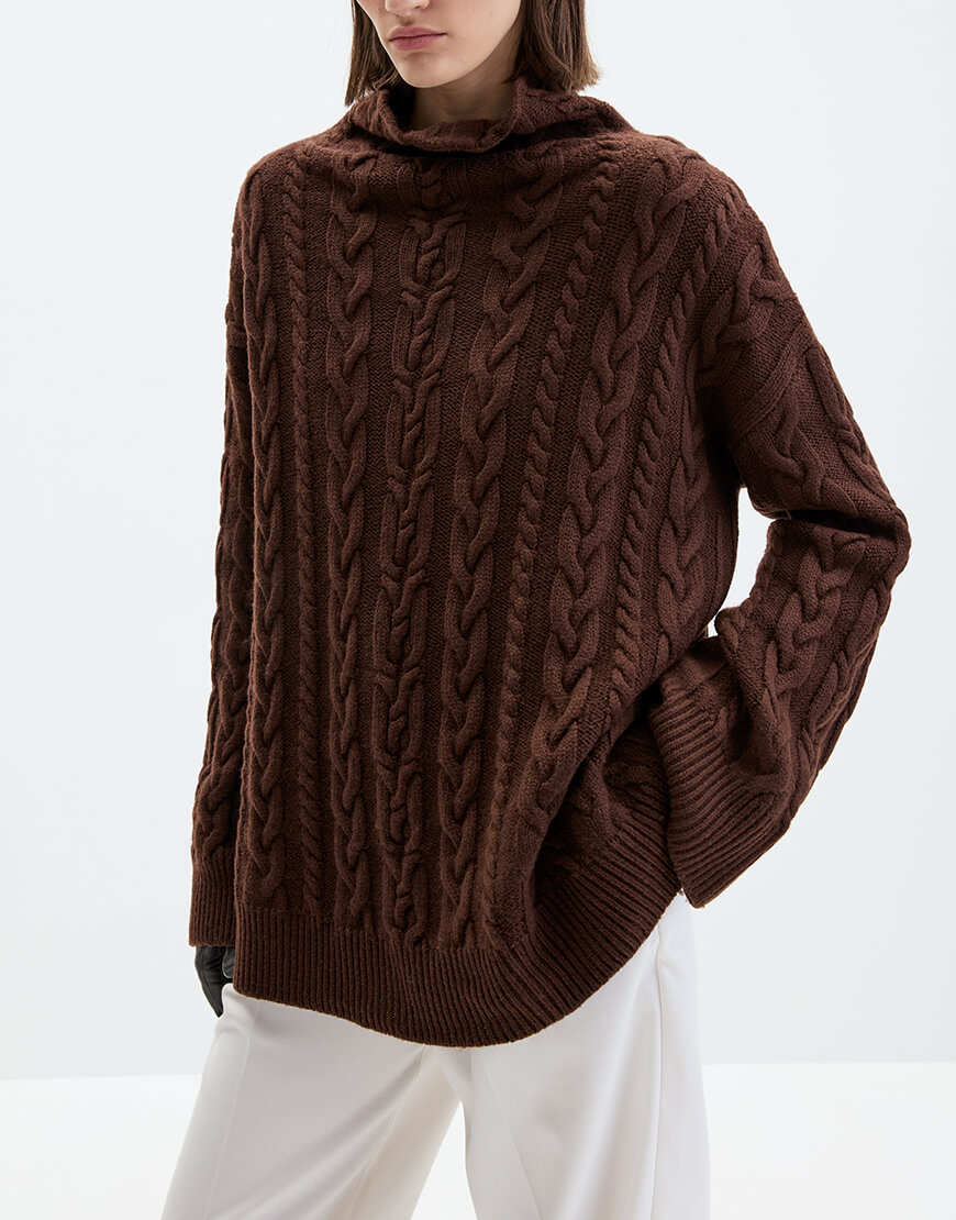Светр прямого крою з м’якої вовни мериносу. Виріб має спущену лінію плеча та високу воріт-стійку, прикрашений візерунком в коси.