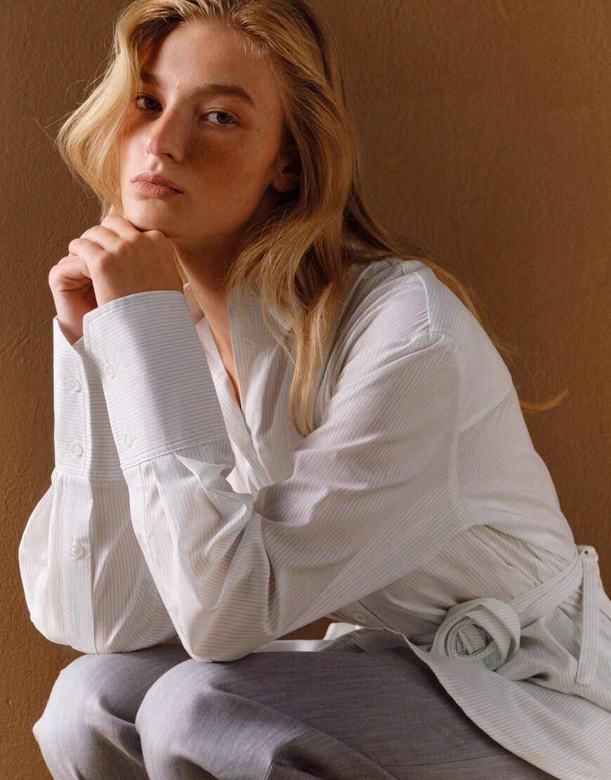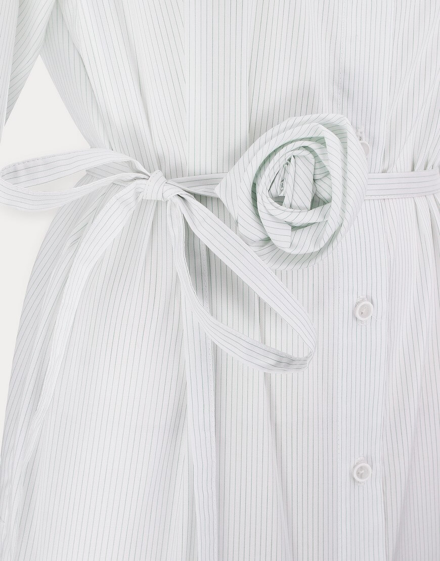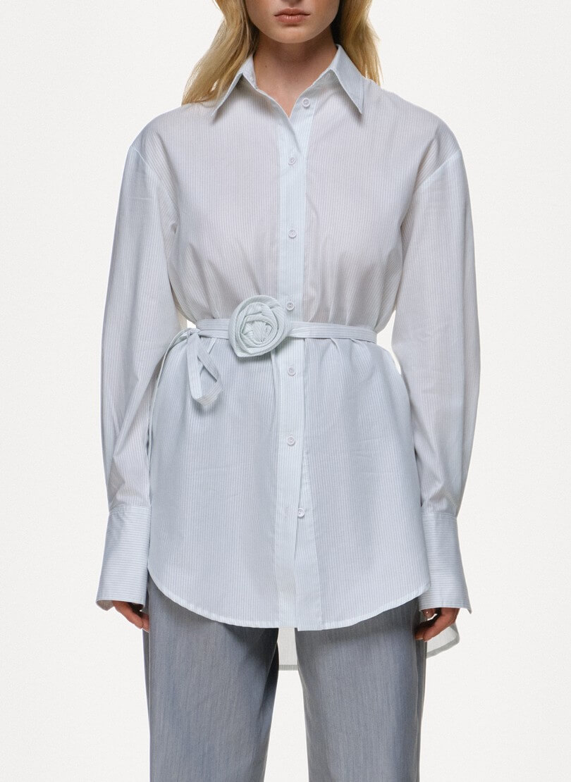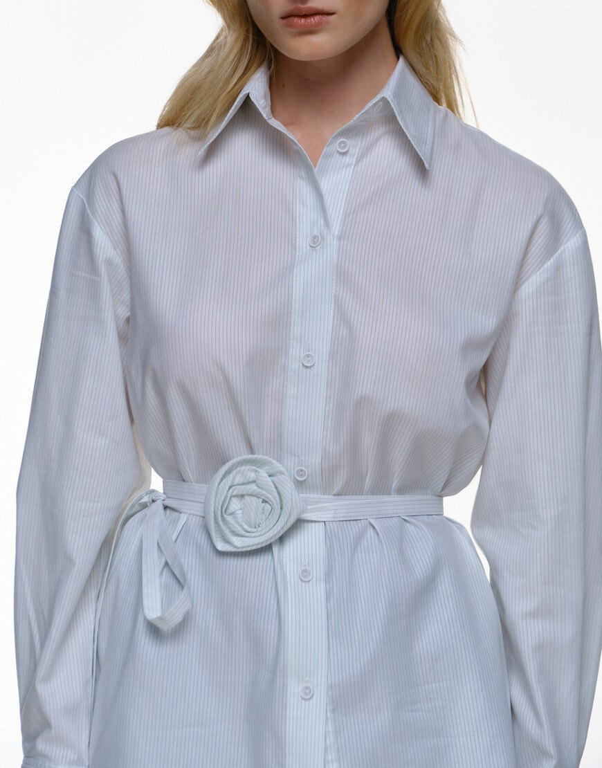 Смугаста сорочка прямого силуету. Декорована знімним поясом з квіткою ручної роботи. Застібається на гудзики.