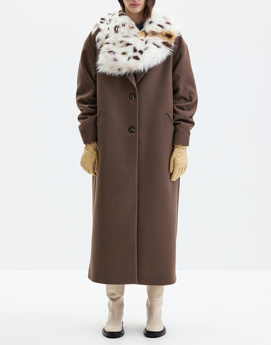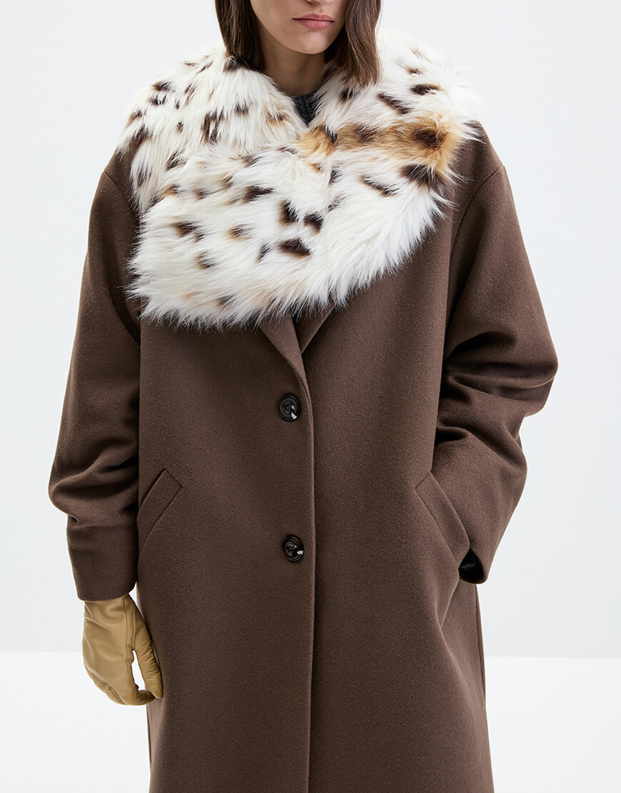 Комір виконаний зі штучного плямистого хутра. Застібається на гачок. Поєднуйте його з верхнім одягом для доповнення образу.