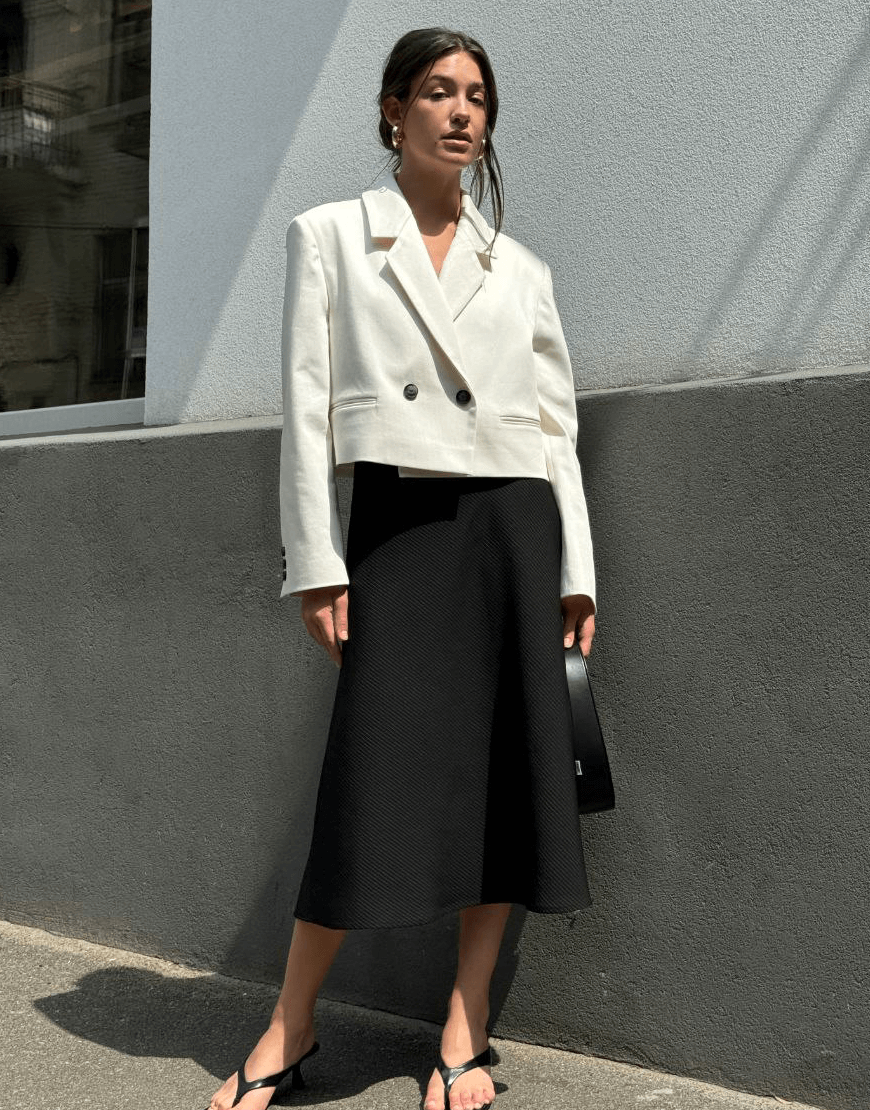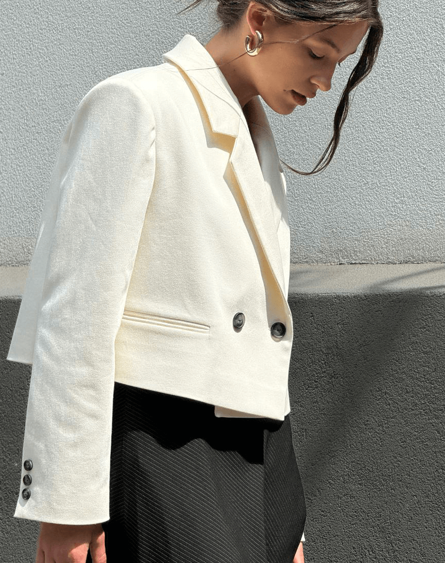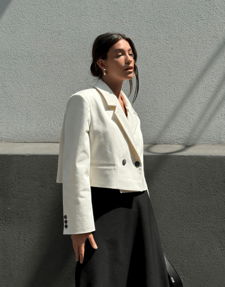Білий вкорочений двубортний жакет з щільного коттону