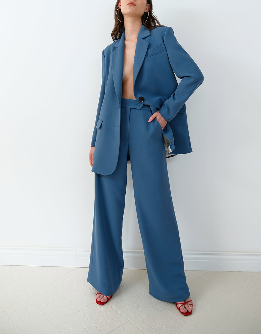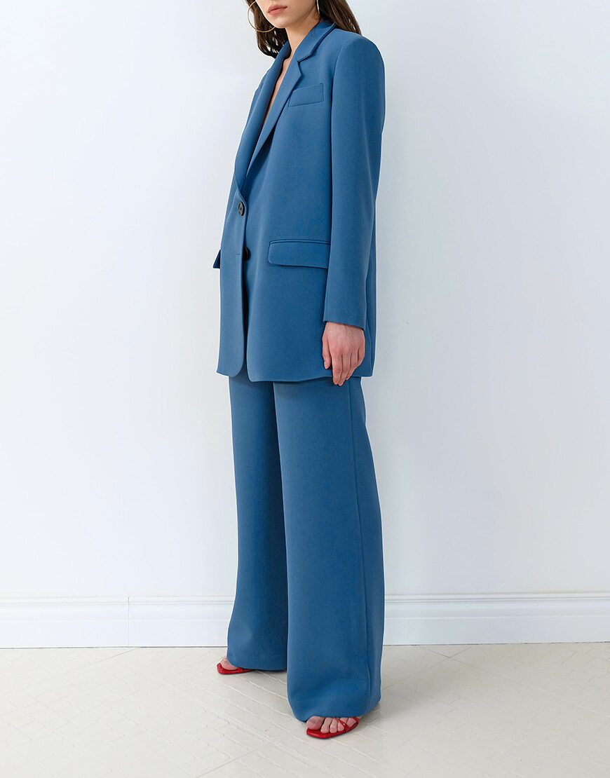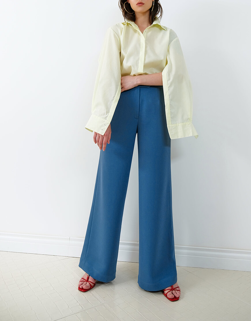 Штани з високою посадкою, широкими штанинами, кишенями в синьому кольорі.