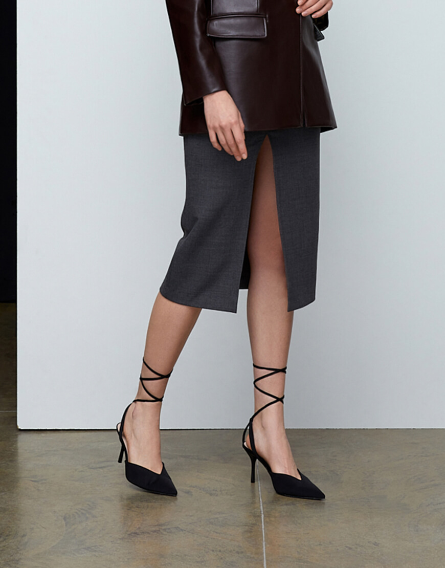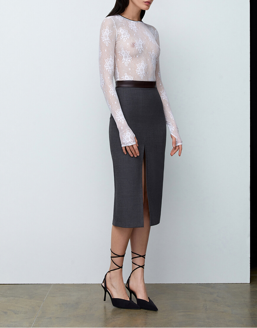 Сіра спідниця з розрізом і деталлю зі шкіри, довжина міді.