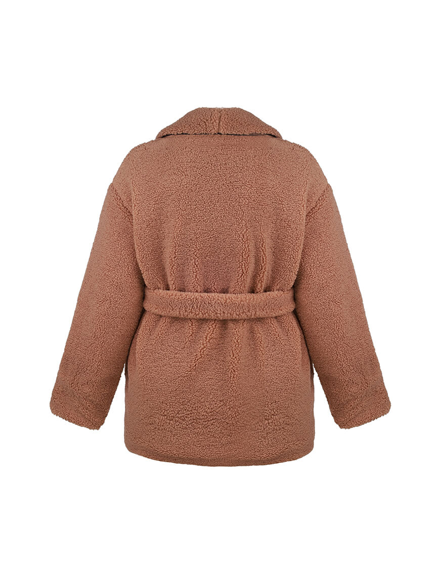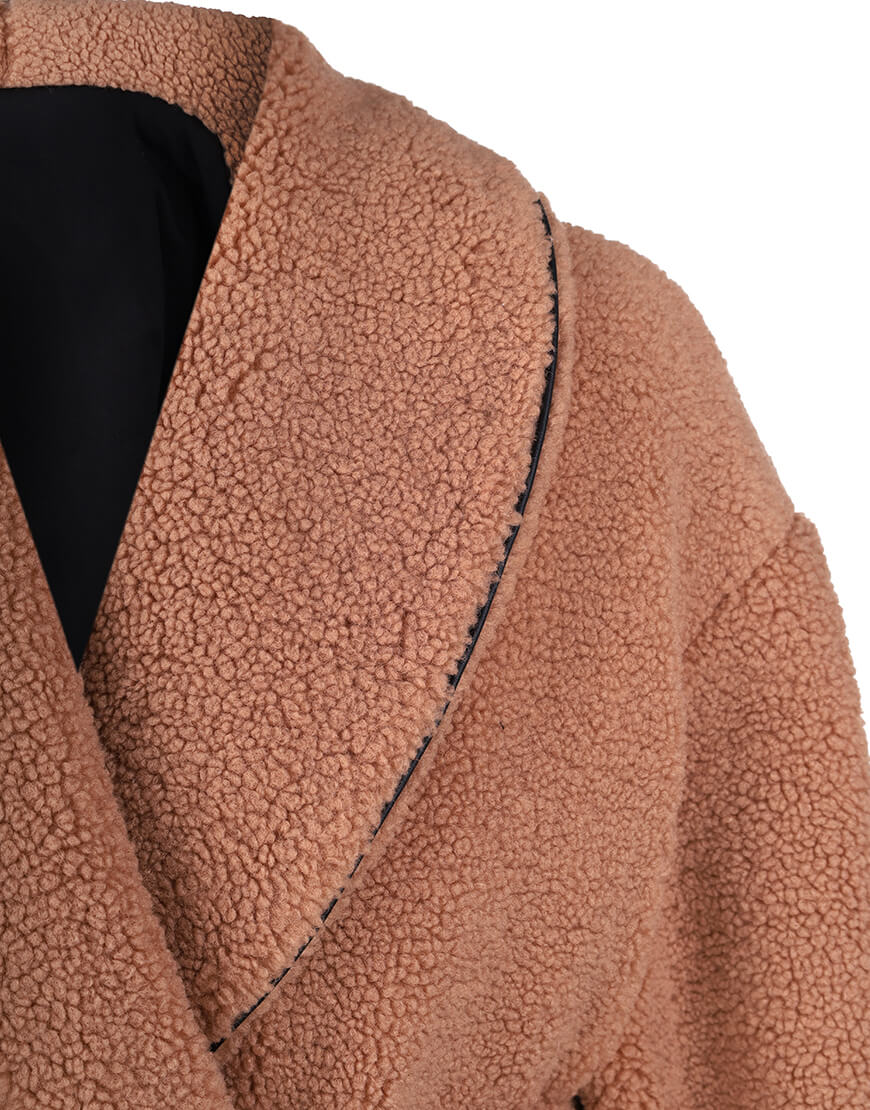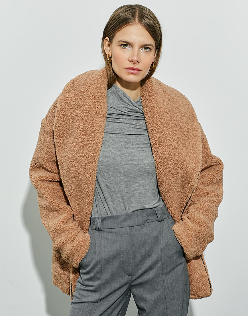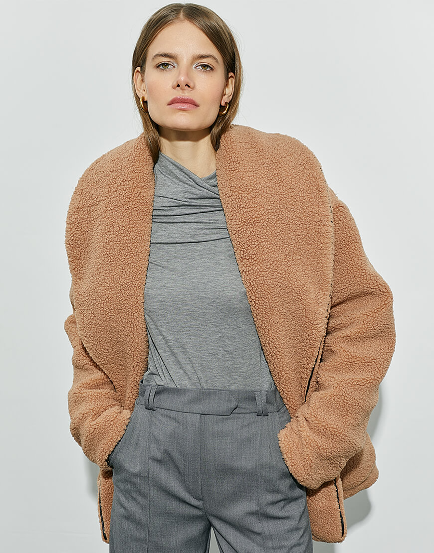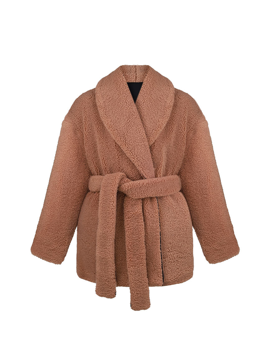 Кімоно зі штучного хутра з поясом та контрастними кантами.
