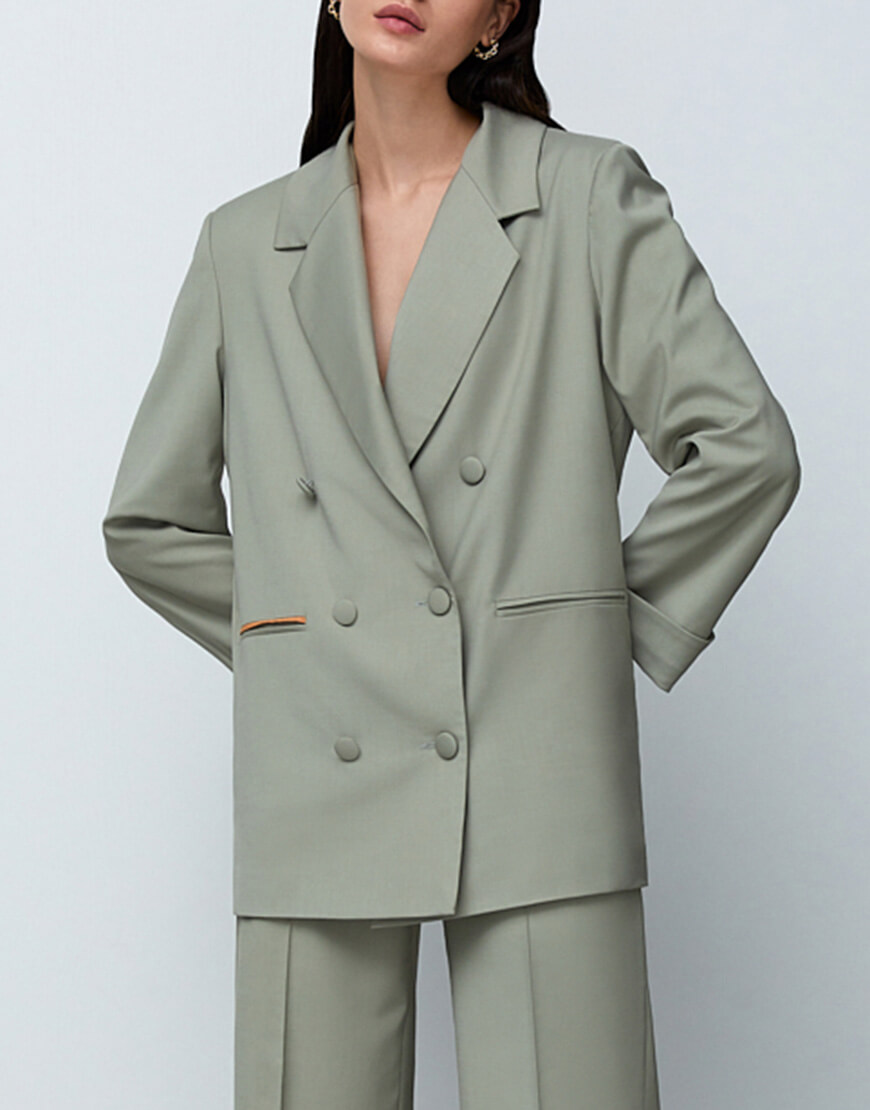 Жакет м’ятний з тонкої вовни, двобортний з ґудзиками і кишенями, об’ємної посадки