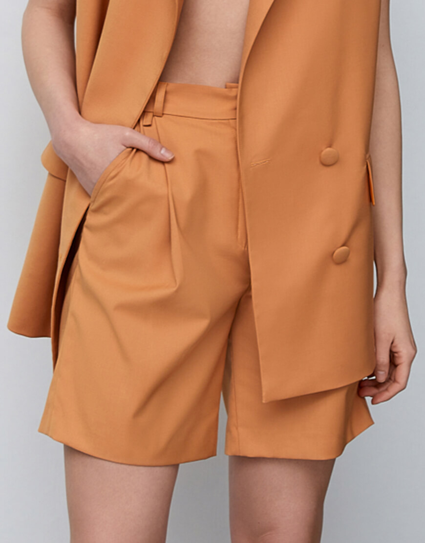 Помаранчеві шорти з високою посадкою і защипами спереду.