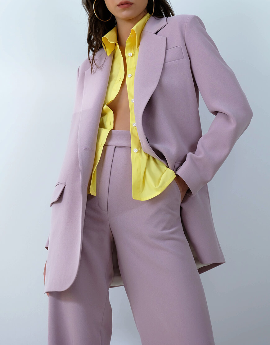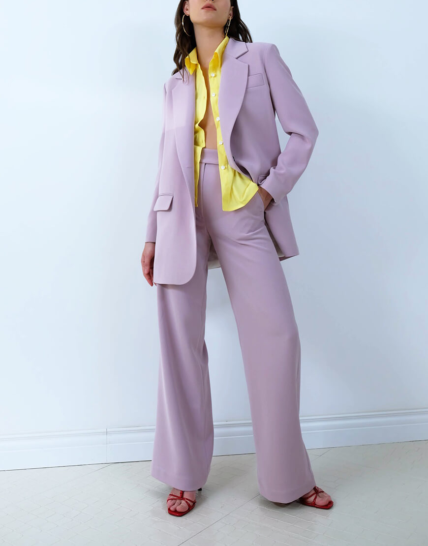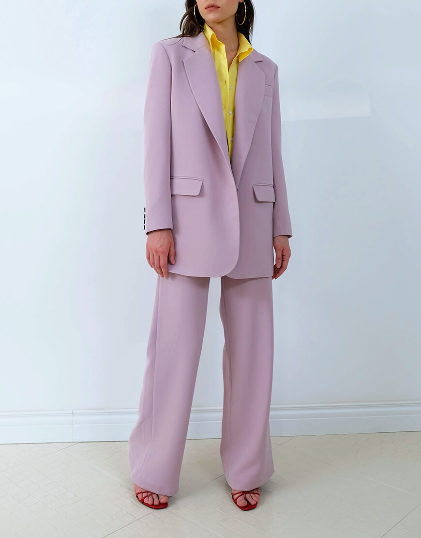 Штани з високою посадкою, широкими штанинами, кишенями в лавандовому кольорі.