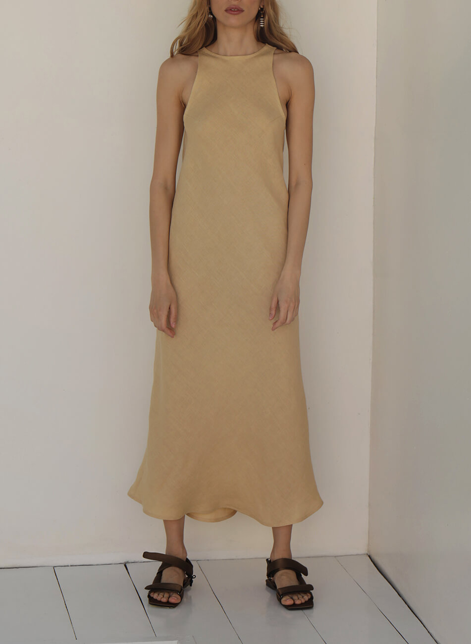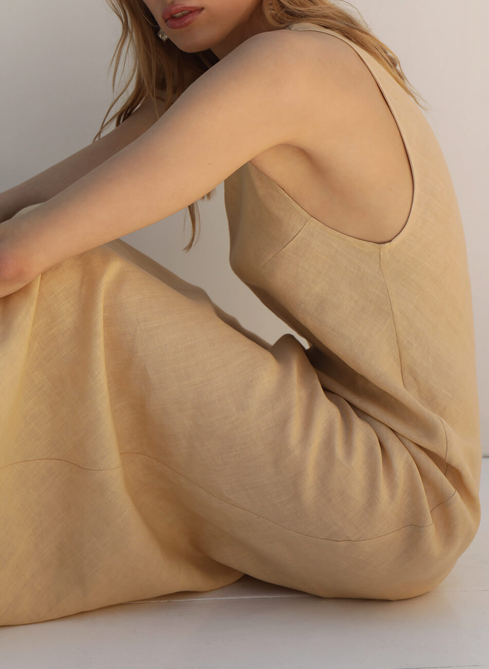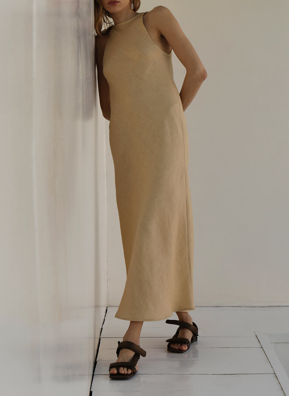 Сукня бежевого кольору, натуральний льон, довжина міді