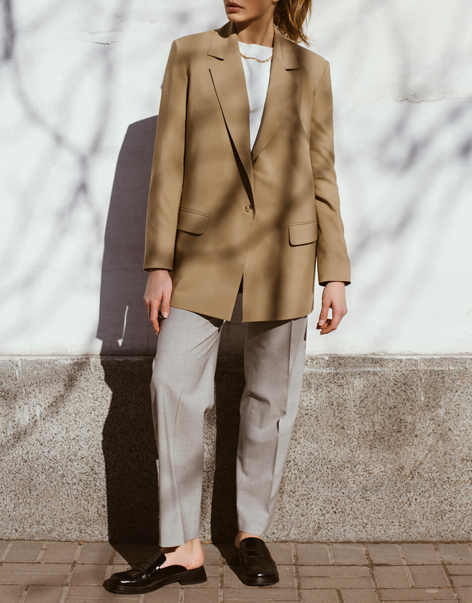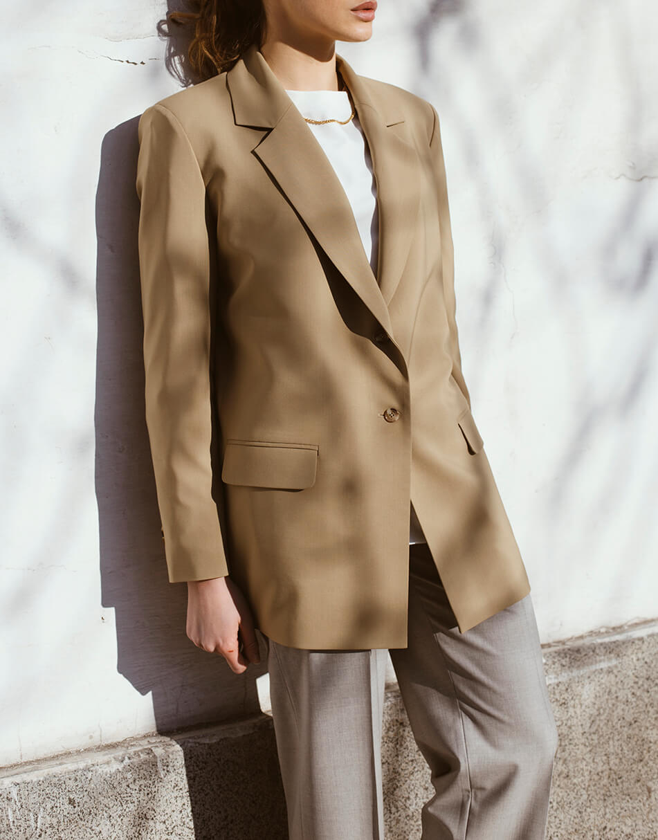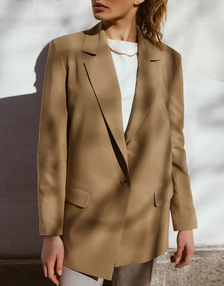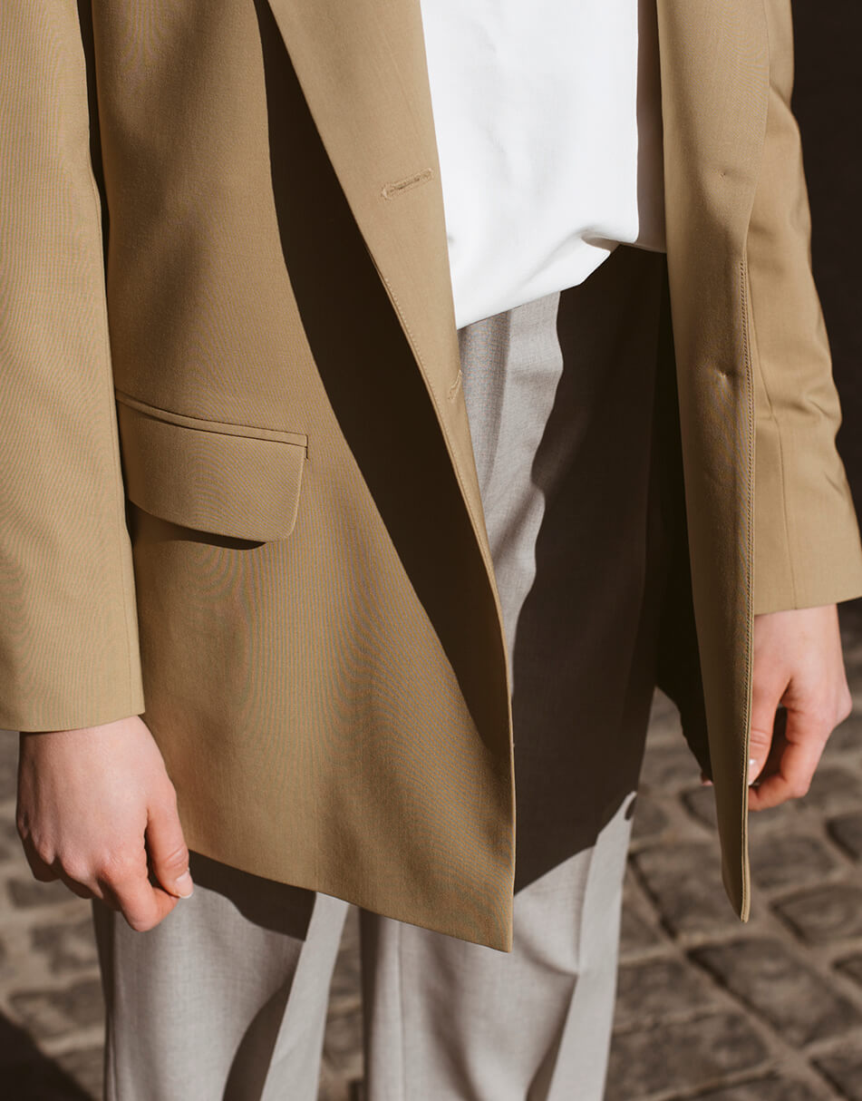Бежевий жакет, з кишенями.