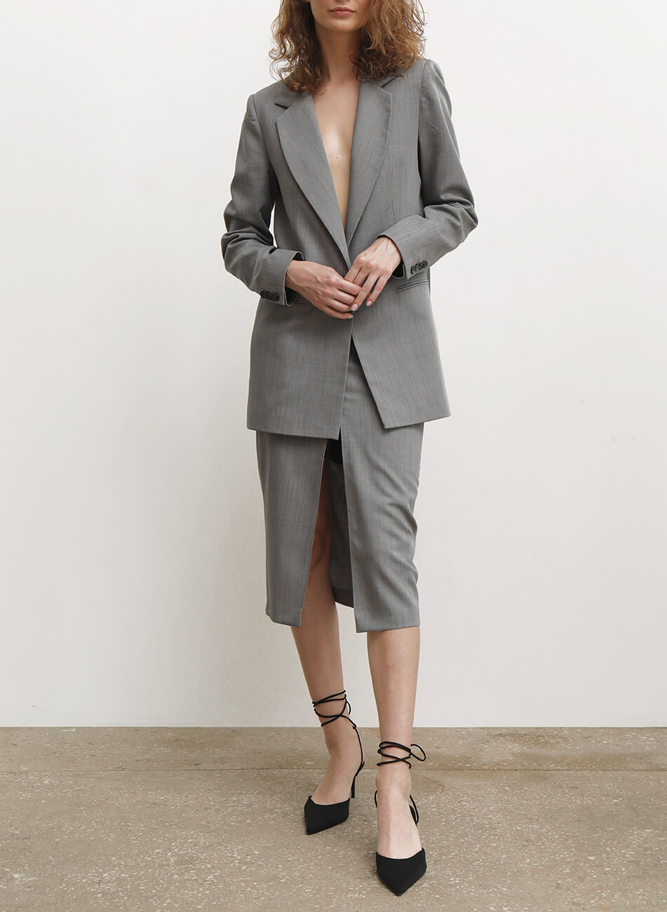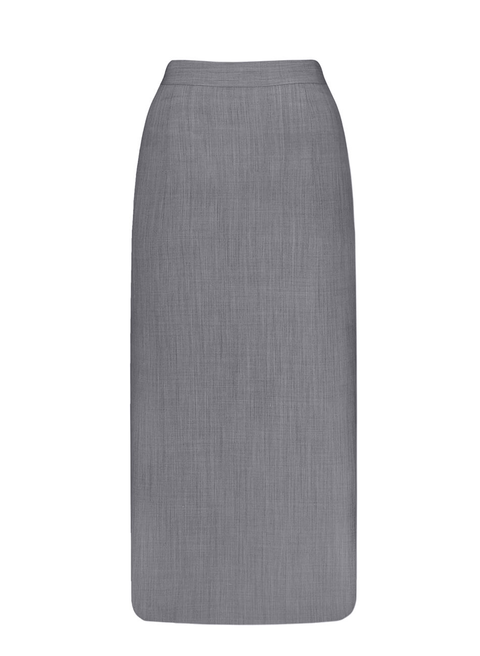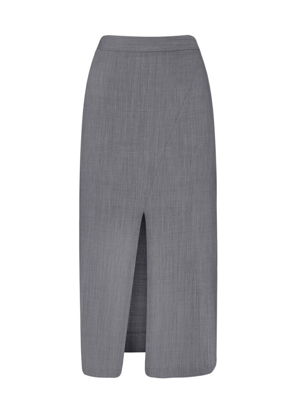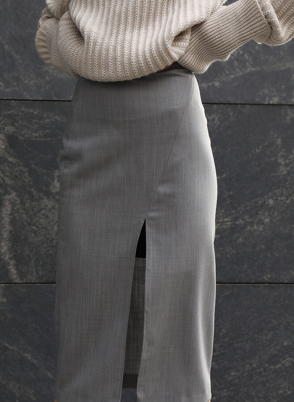 Сіра спідниця міді, з високою посадкою і розрізом