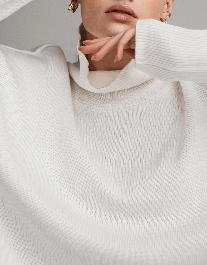 Светр виконаний з м’якої та приємної до тіла пряжі. Модель вільного крою, зі спущеною лінією плеча та з високою горловиною в рубчик. Манжети та нижній край вив’язані широкою резинкою, завдяки якій краї светру не розтягуються.