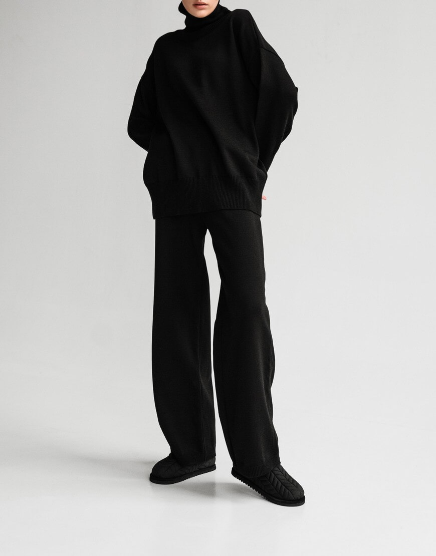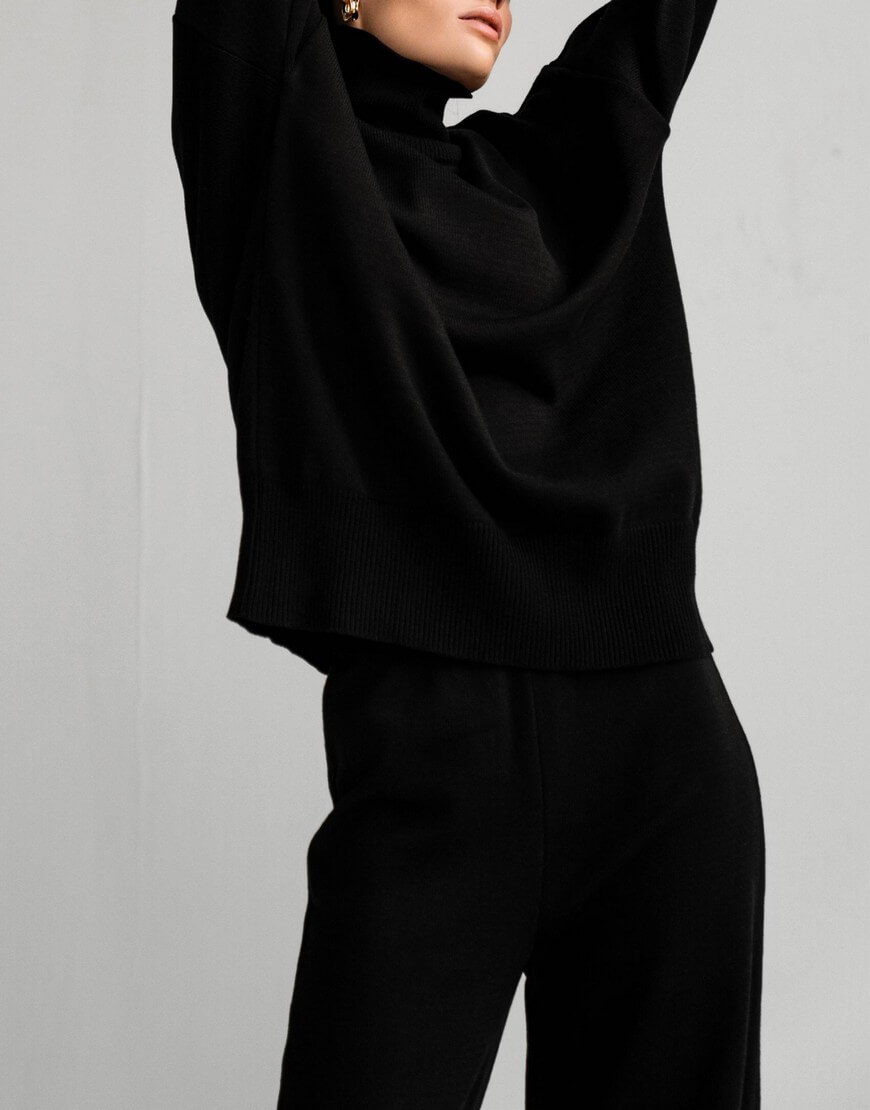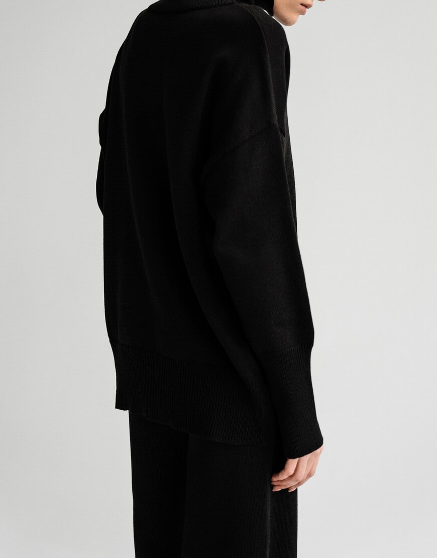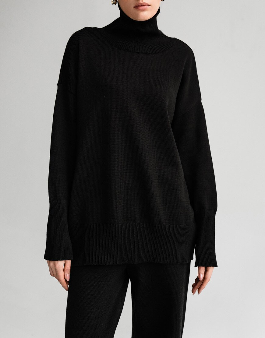 Светр виконаний з м’якої та приємної до тіла пряжі. Модель вільного крою, зі спущеною лінією плеча та з високою горловиною в рубчик. Манжети та нижній край вив’язані широкою резинкою, завдяки якій краї светру не розтягуються.