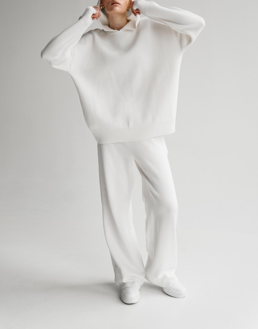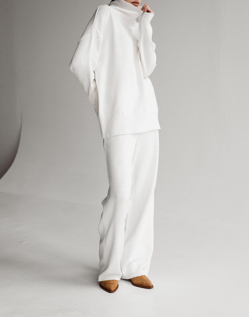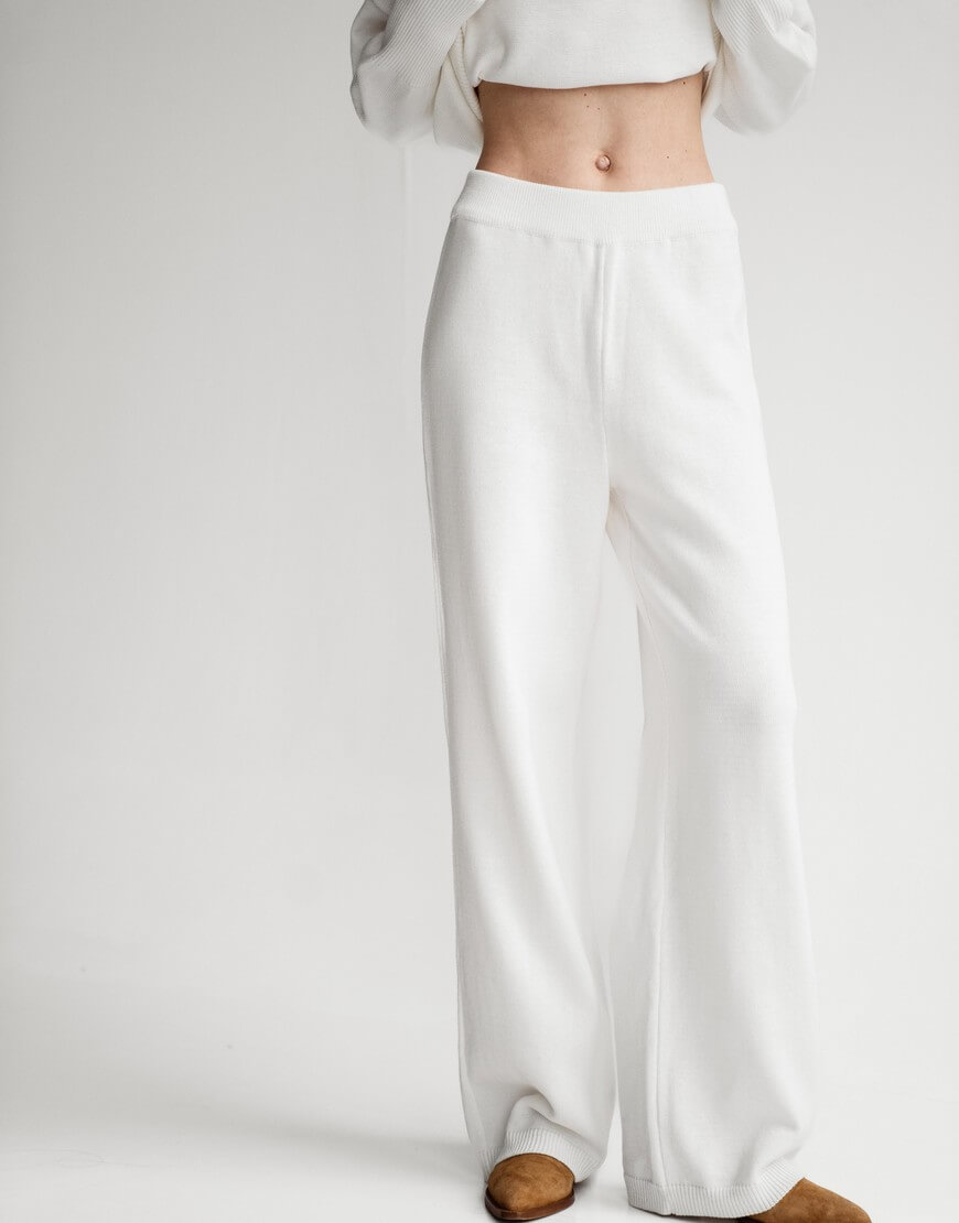 Штани виконані з м’якої та приємної до тіла пряжі. Носіть їх з пуховикам, будь-якими светрами чи затишним худі з нашої колекції. Максимально прості, з еластичним поясом та без кишень. Дана модель штанів підкреслює талію завдяки високій посадці.