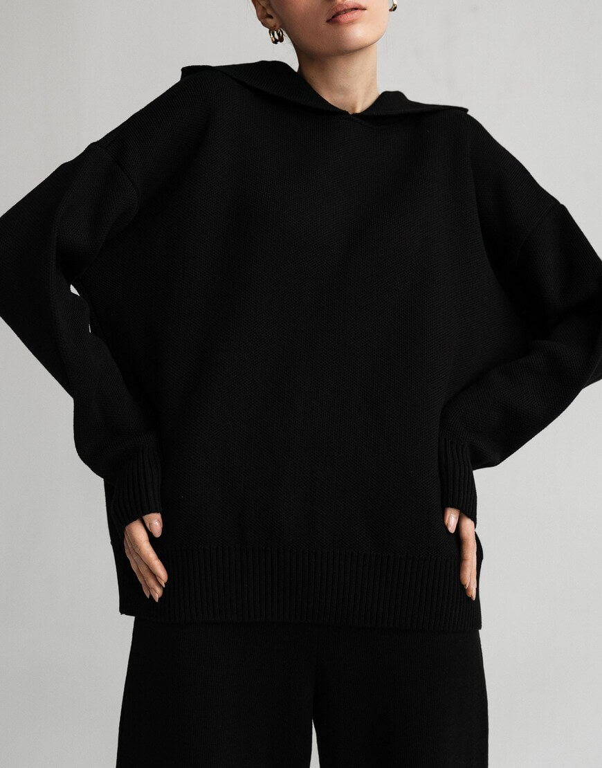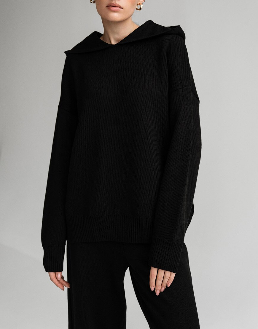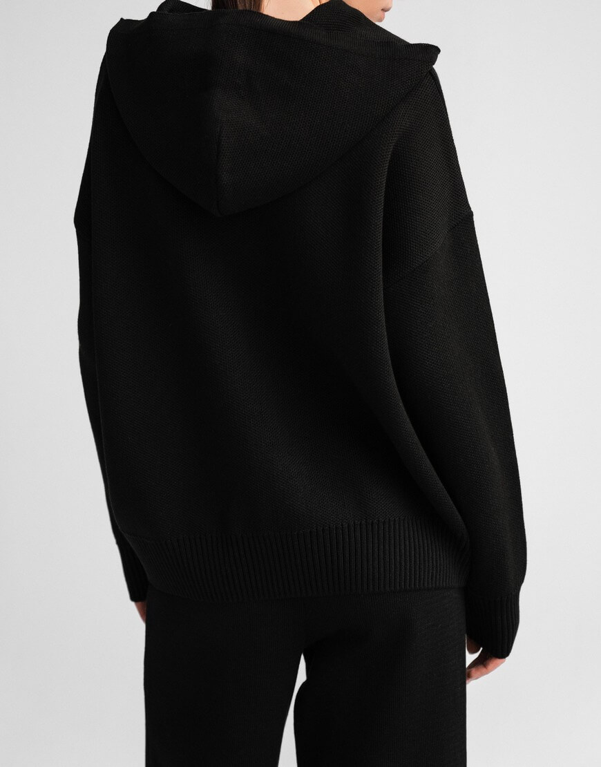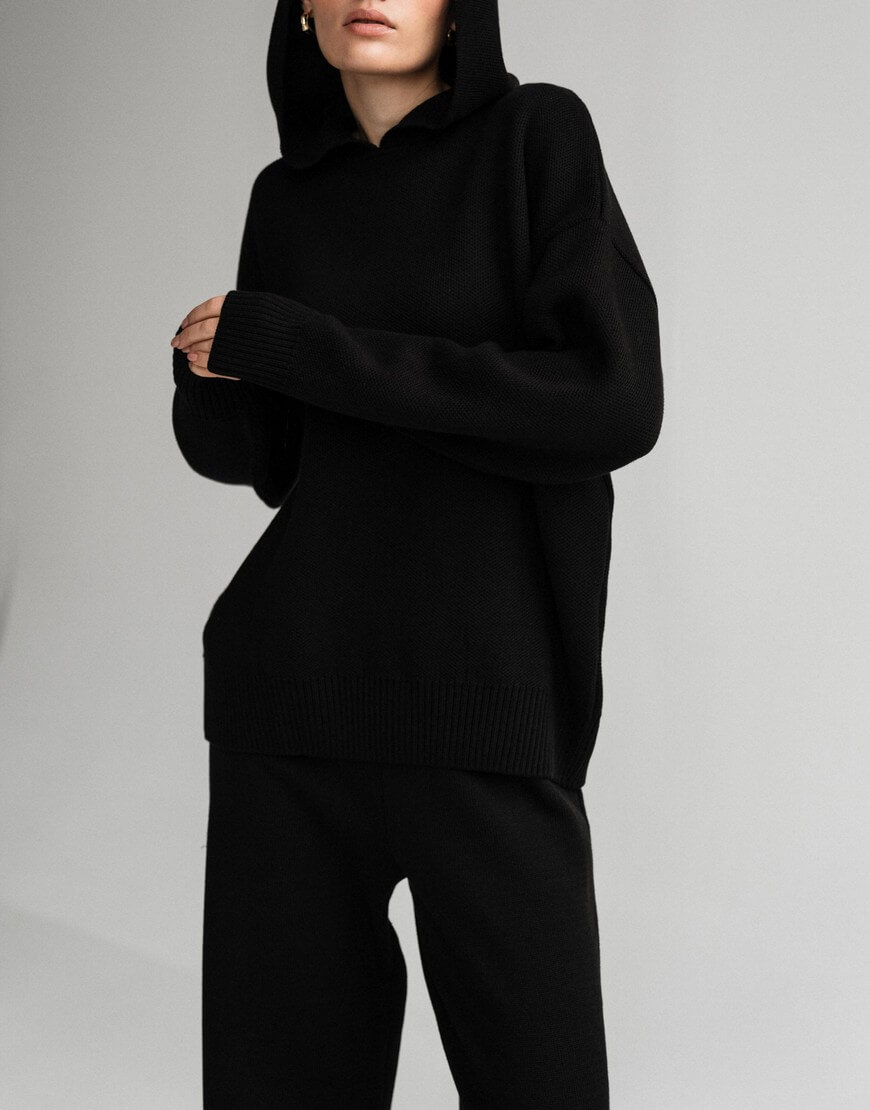 Незамінний в прохолодну погоду худі, виконаний з м’якої та приємної до тіла пряжі. Модель вільного крою зі спущеною лінією плеча та капюшоном. Воно не обмежує рухи та гарно доповнює образи з пальто та пуховиками. Образ з худі завершать джинси, легінси чи трикотажні штани, які можна придбати в комплекті.