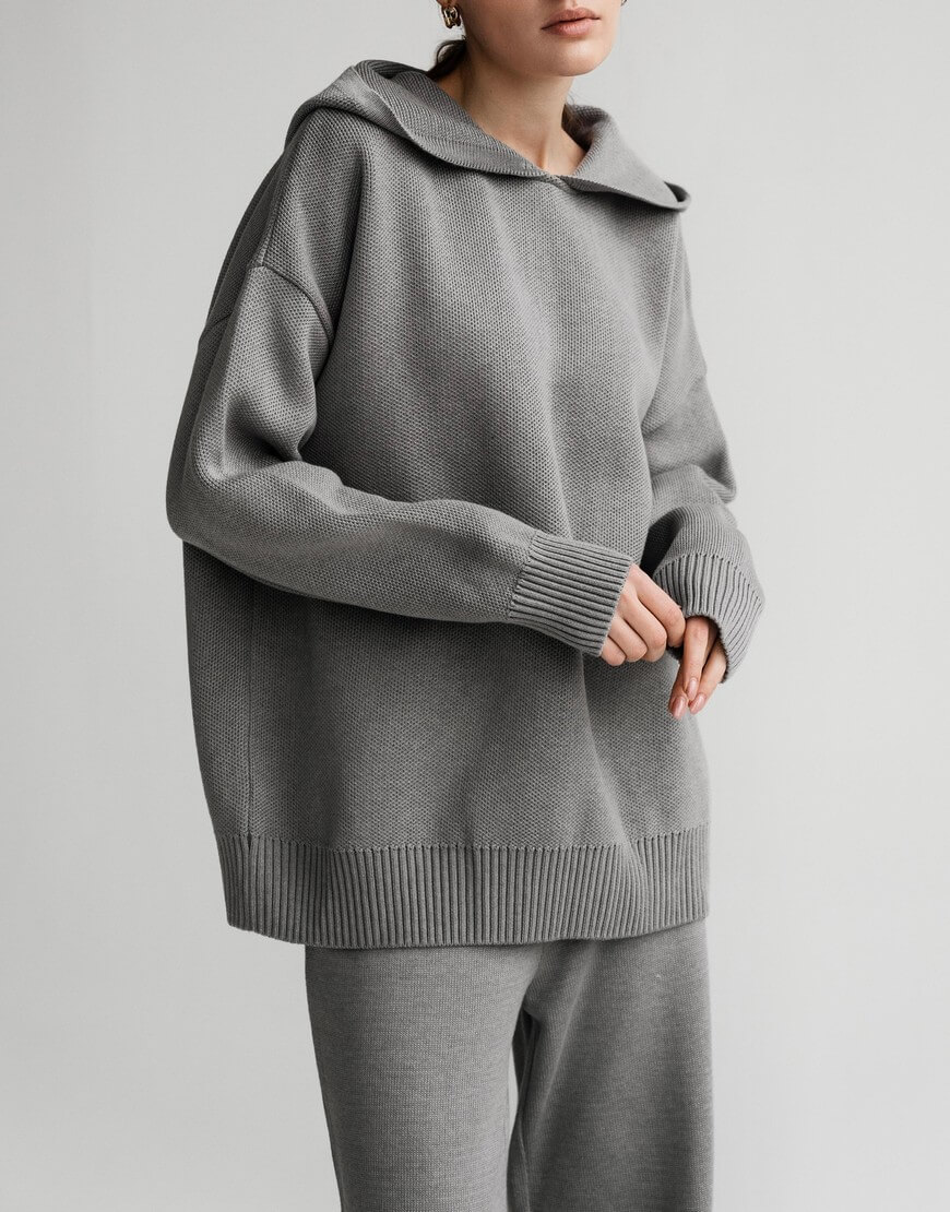 Незамінний в прохолодну погоду худі, виконаний з м’якої та приємної до тіла пряжі. Модель вільного крою зі спущеною лінією плеча та капюшоном. Воно не обмежує рухи та гарно доповнює образи з пальто та пуховиками. Образ з худі завершать джинси, легінси чи трикотажні штани, які можна придбати в комплекті.