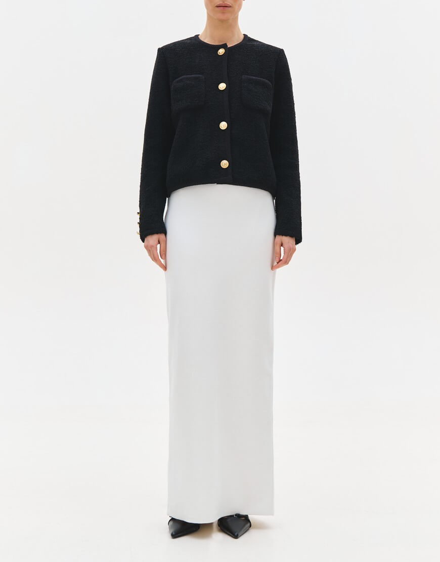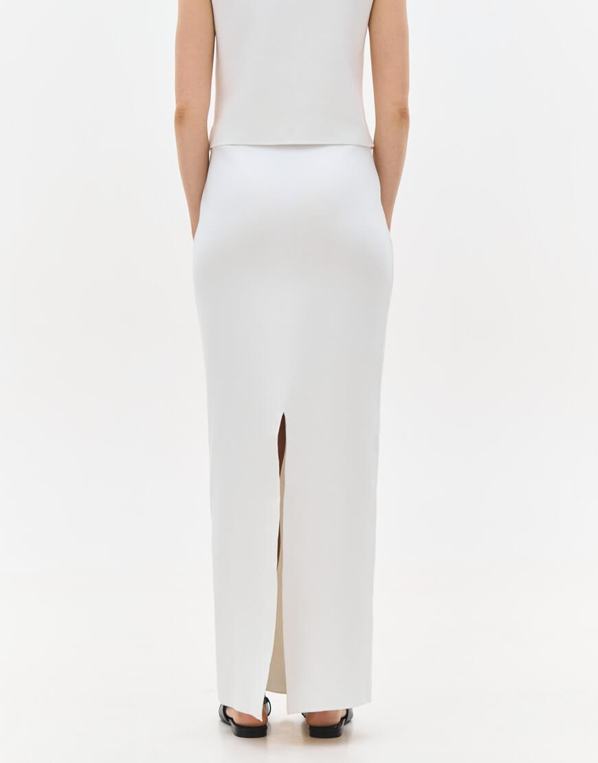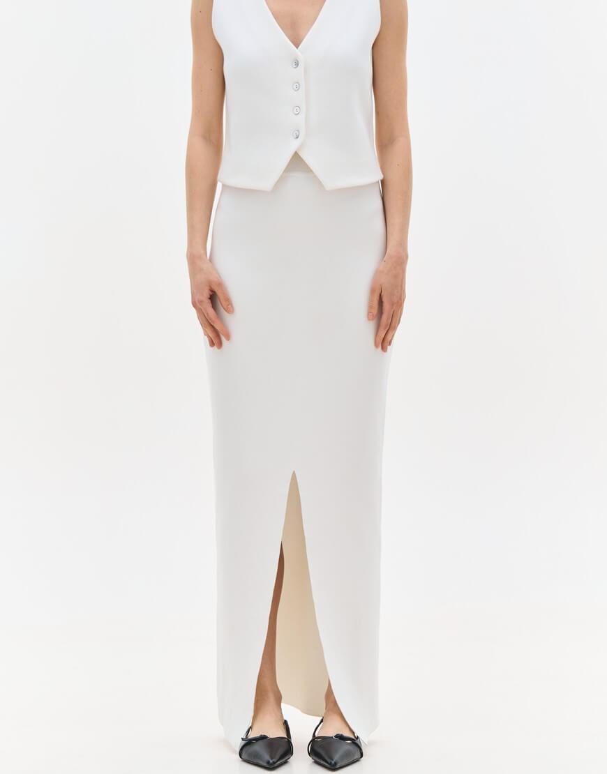 Елегантна максі-спідниця з високою лінією талії та розрізом. В основі пряжі – ніжна та приємна до тіла нитка з віскози стрейч та бавовни. Неймовірно вишукано та елегантно виглядає в комбінації з жилетом Podyh або з будь-яким з наших жакетів.