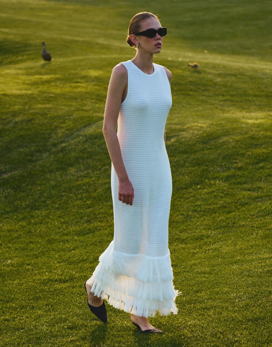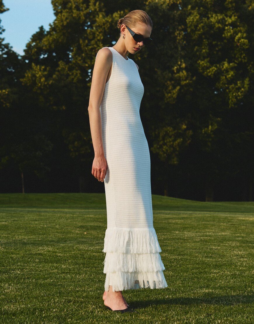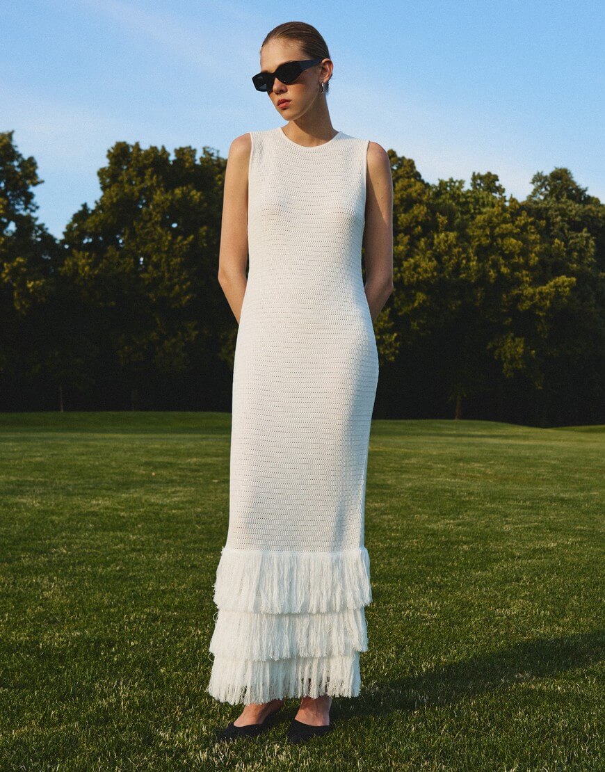 Доставка впродовж 2-5 робочих днівАжурна сукня прямого силуетного крою, оздоблена потрійною бахромою. Позаду сукні передбачено розріз.