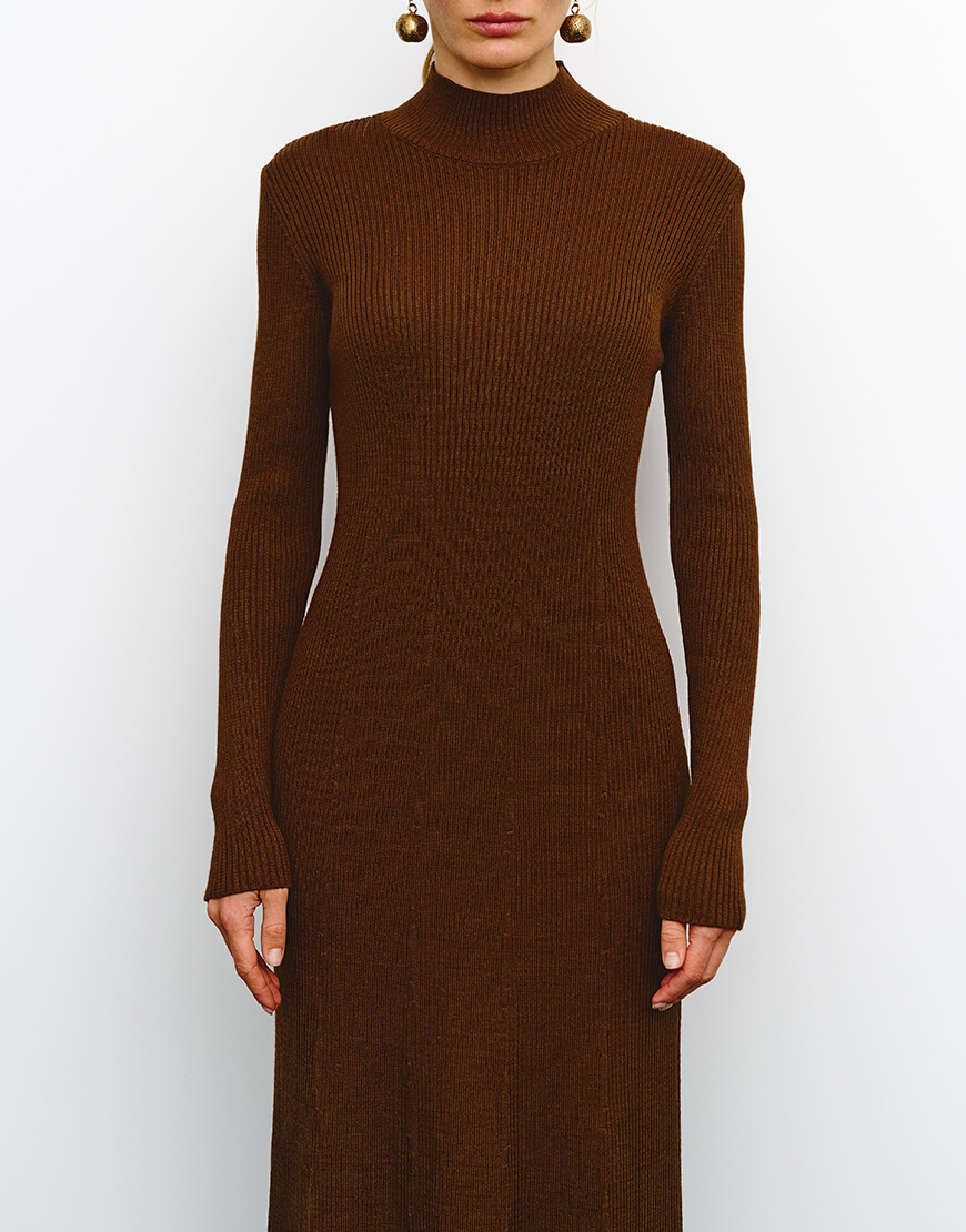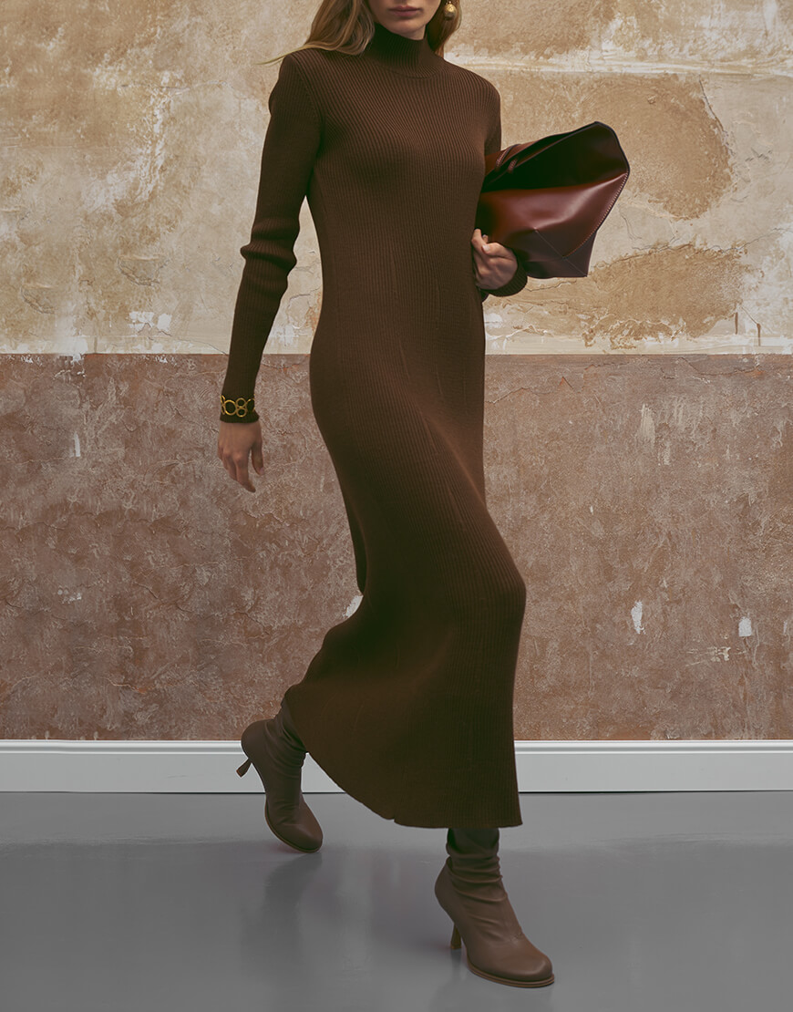 Лаконічна модель сукні максі. Витончений та елегантний силует сукні досягається за рахунок в’язки в рубчик та виконання сукні з пряжі, яка містить вовну.