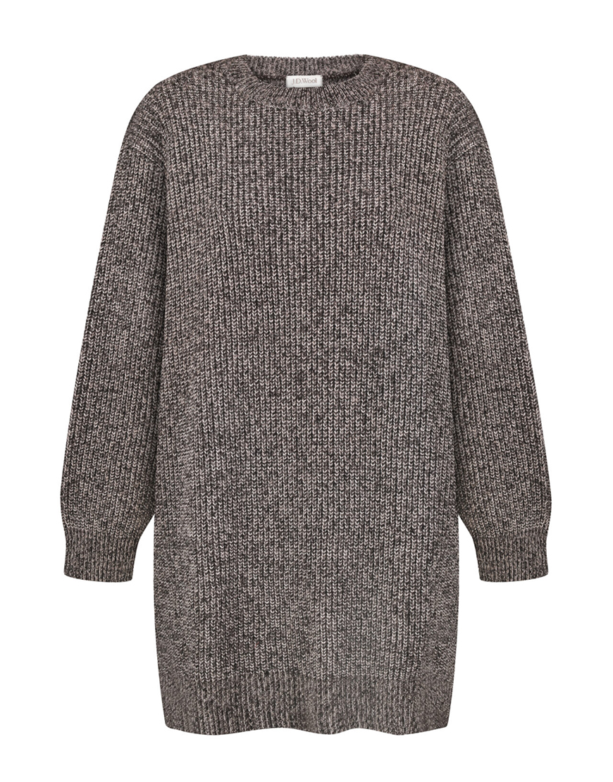 Сукня має вільний силует, текстуровану вʼязку, спущену лінію плеча та доповнена широкими вивʼязаними рубчиком манжетами. Сукня виконана з вовни коричневого кольору.