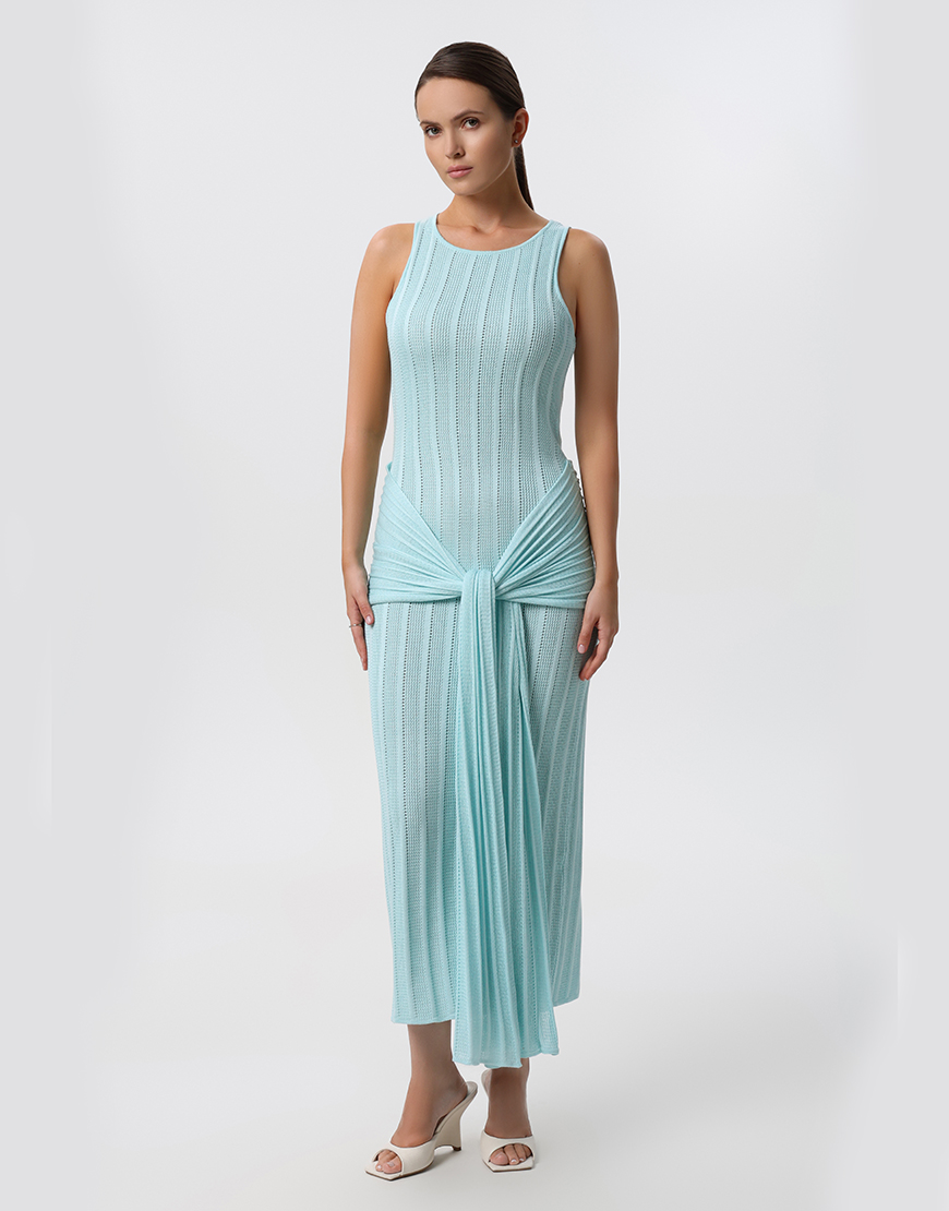 Доставка впродовж 2-5 робочих днівЕлегантна сукня довжини максі, має виражену фактурну вʼязку, що додає витонченості. Родзинкою даної моделі сукні є драпірування на стегнах.