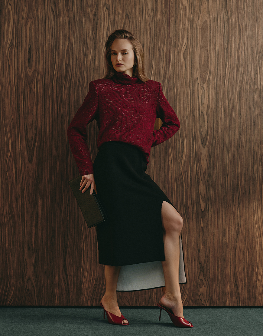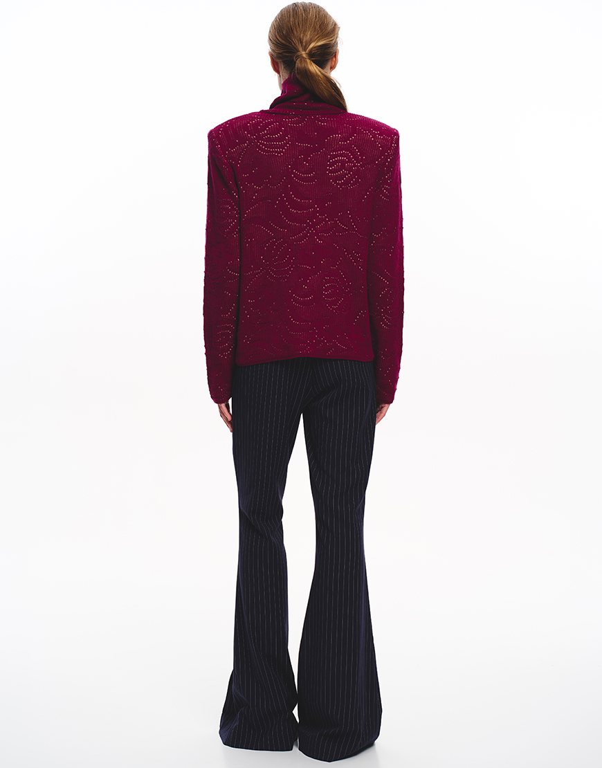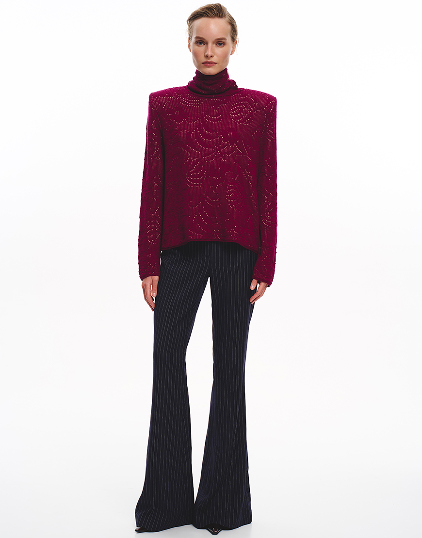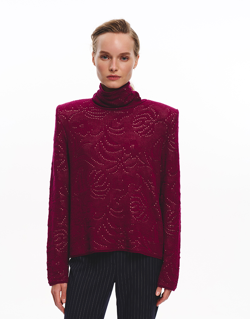 Для того, щоб восени та взимку ви змогли створювати класичні образи, до нашої колекції ми додали витончений та елегантний светр вільного, прямого крою з акцентними плечима. Акцентні плечі досягнуто за рахунок підплічників. Родзинкою даної моделі светра є ажурний візерунок в квіти.