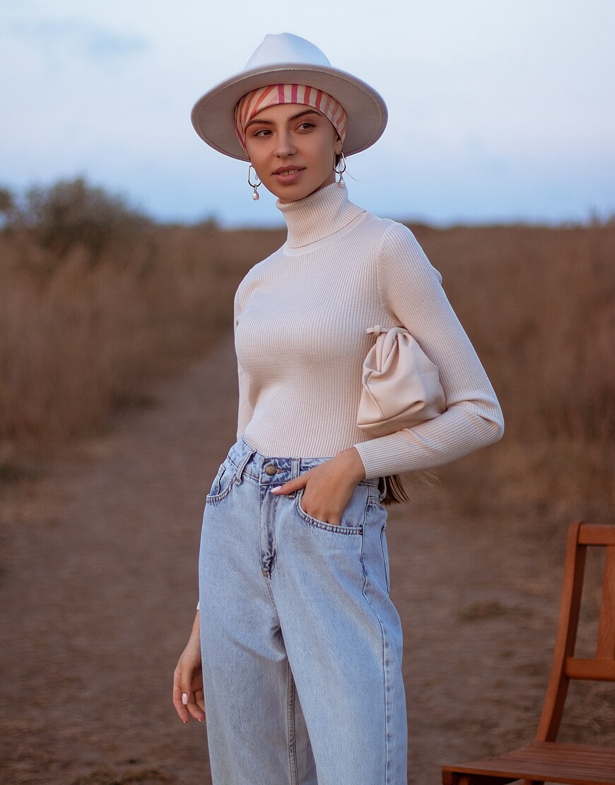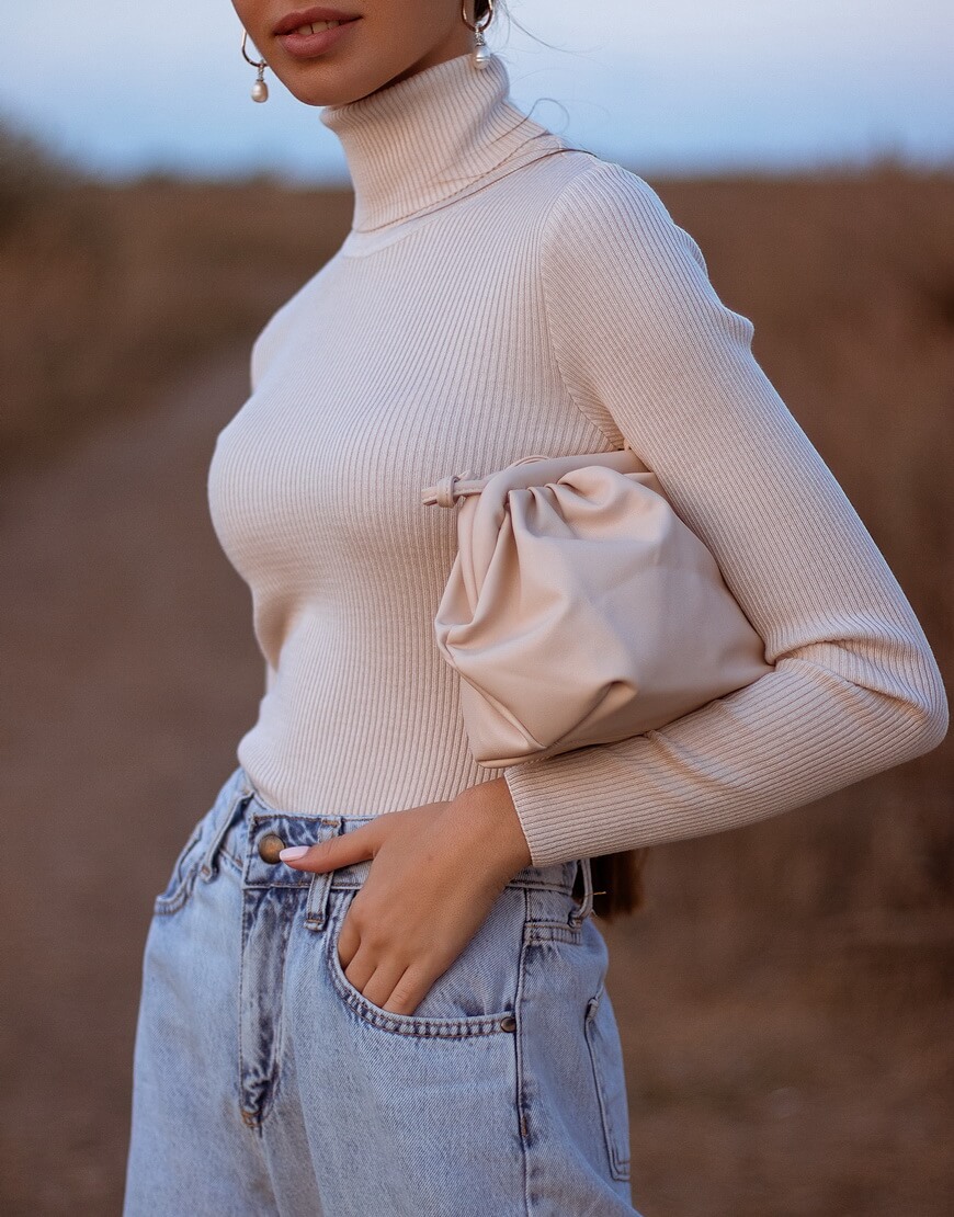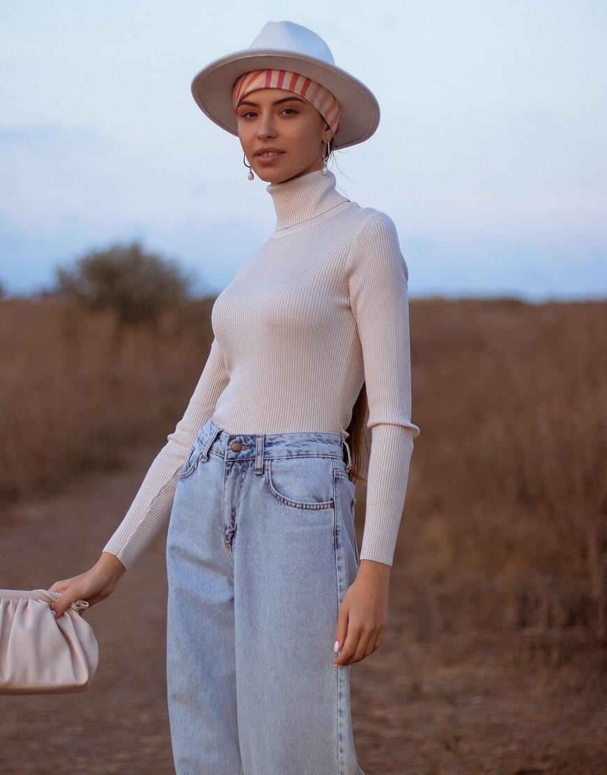 Гольф у рубчик з класичним високим коміром і довгими рукавами. Виконаний з віскозної нитки, м’якої та еластичної, приємної до тіла.