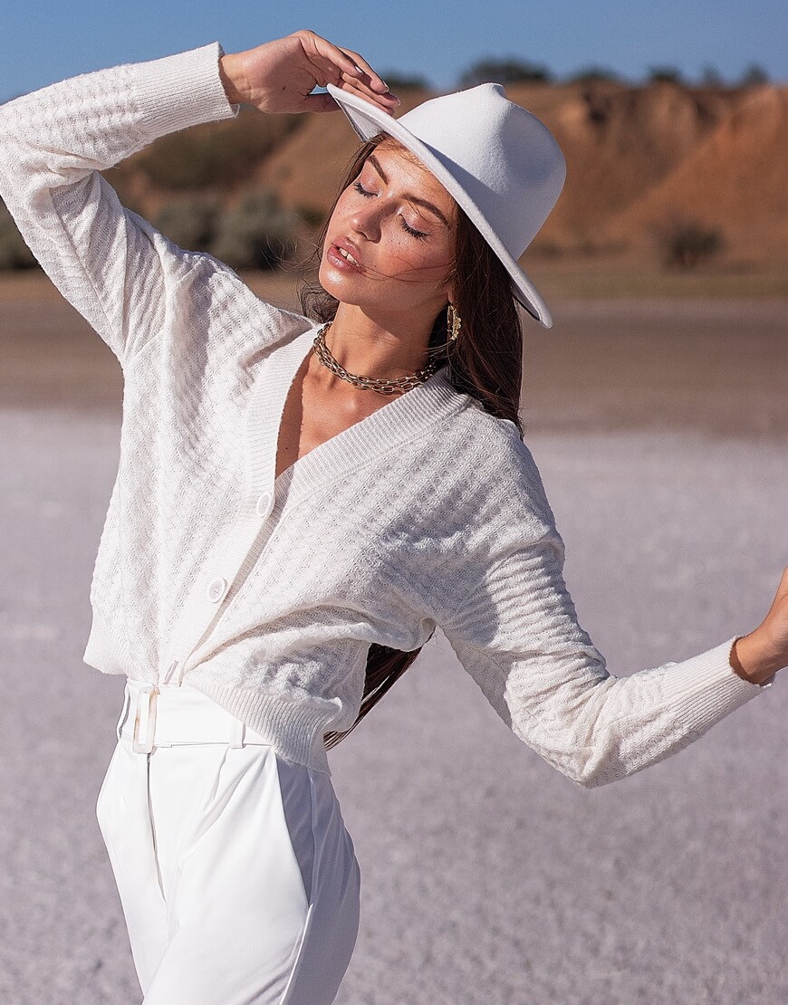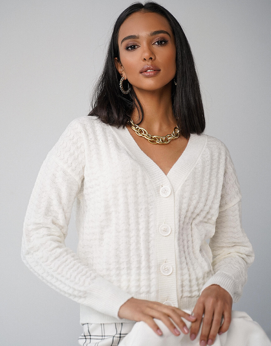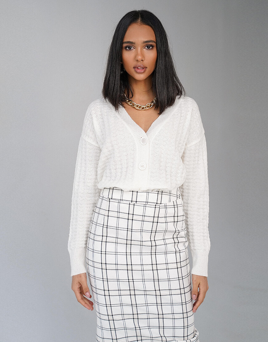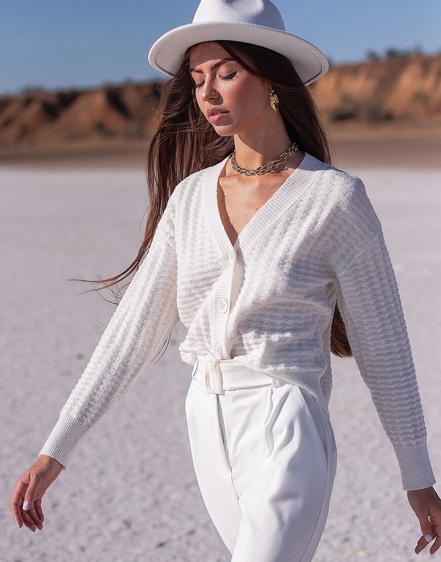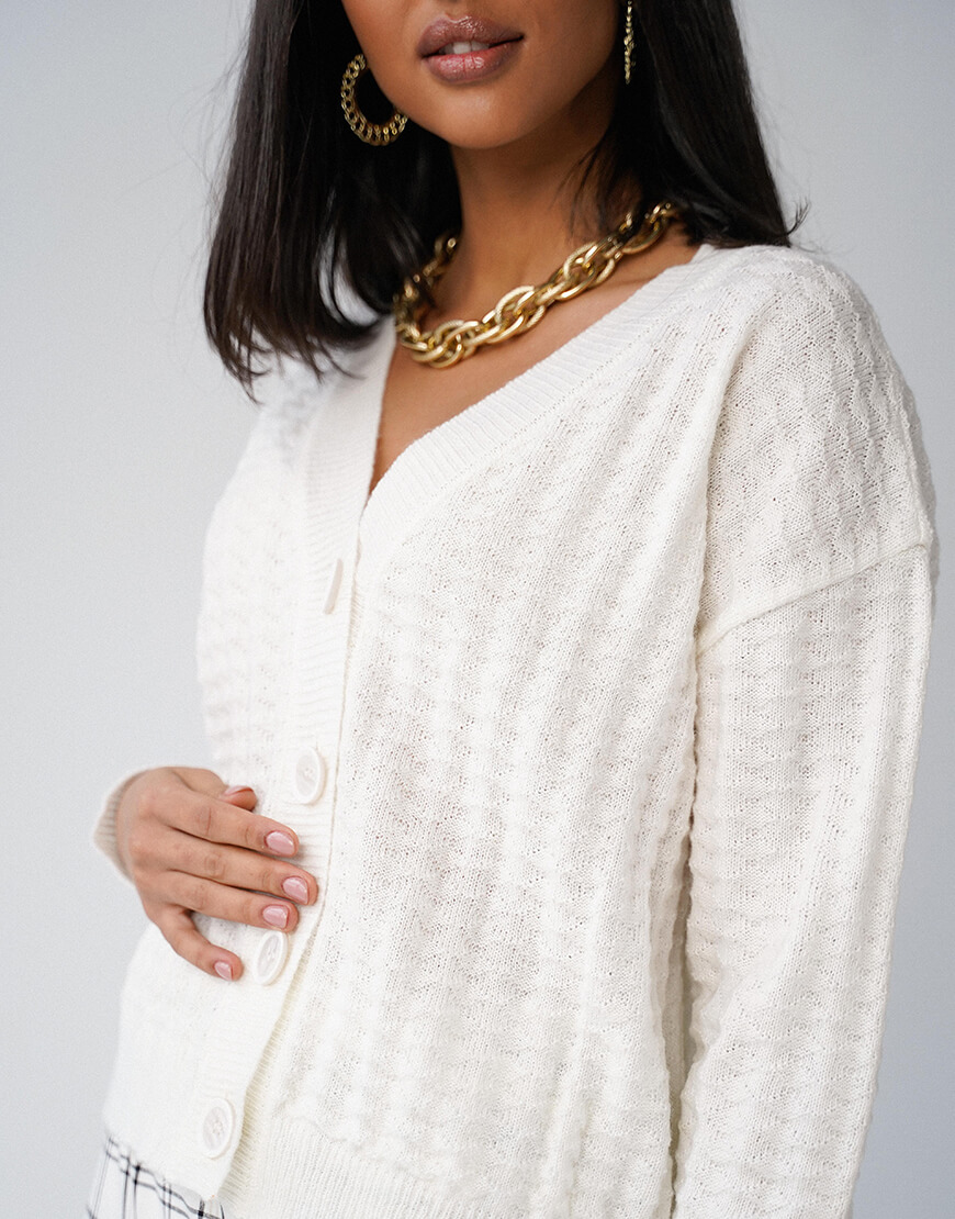 Укорочений кардиган на ґудзиках. Кардиган вільного силуету, зі спущеною лінією плеча.