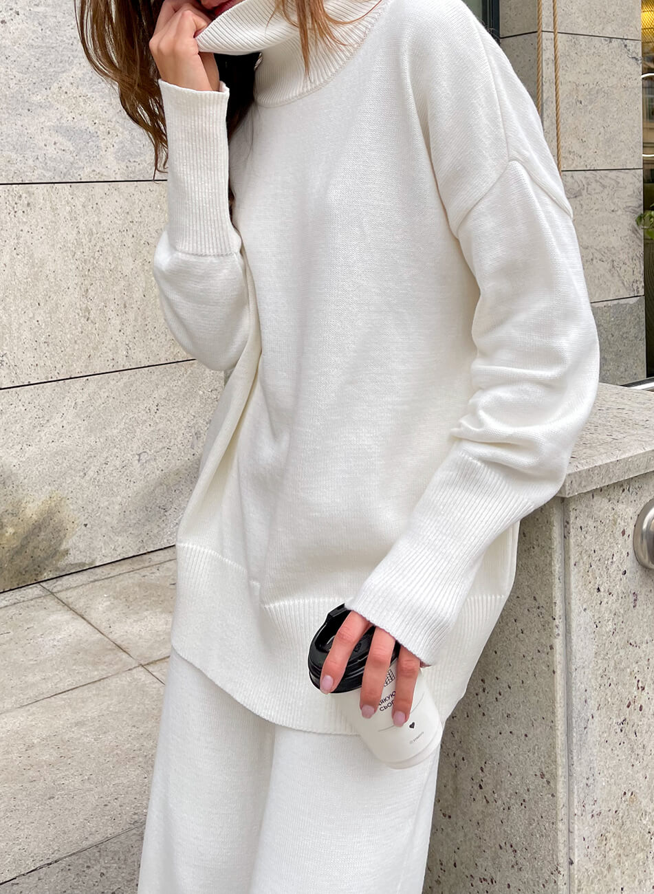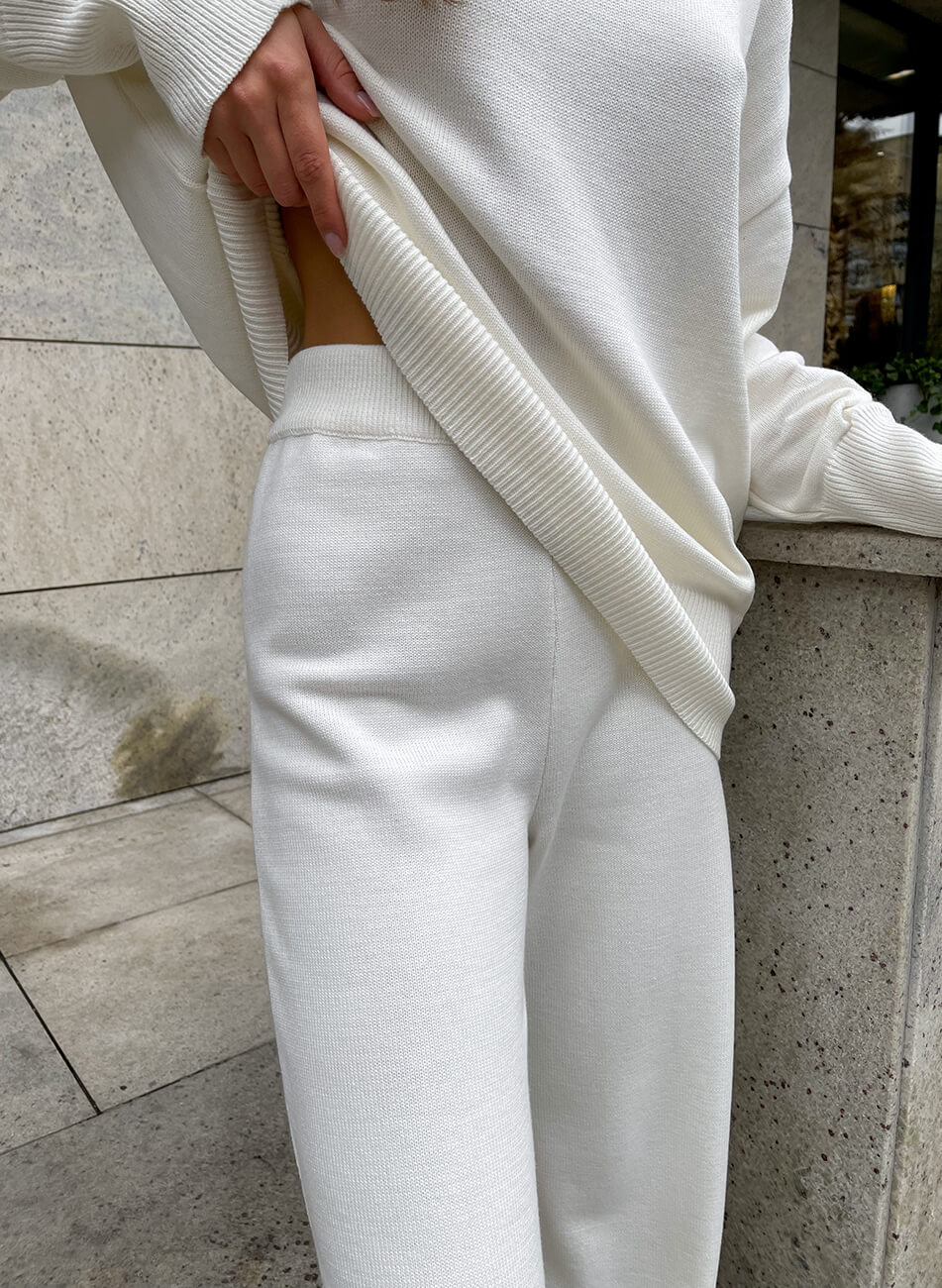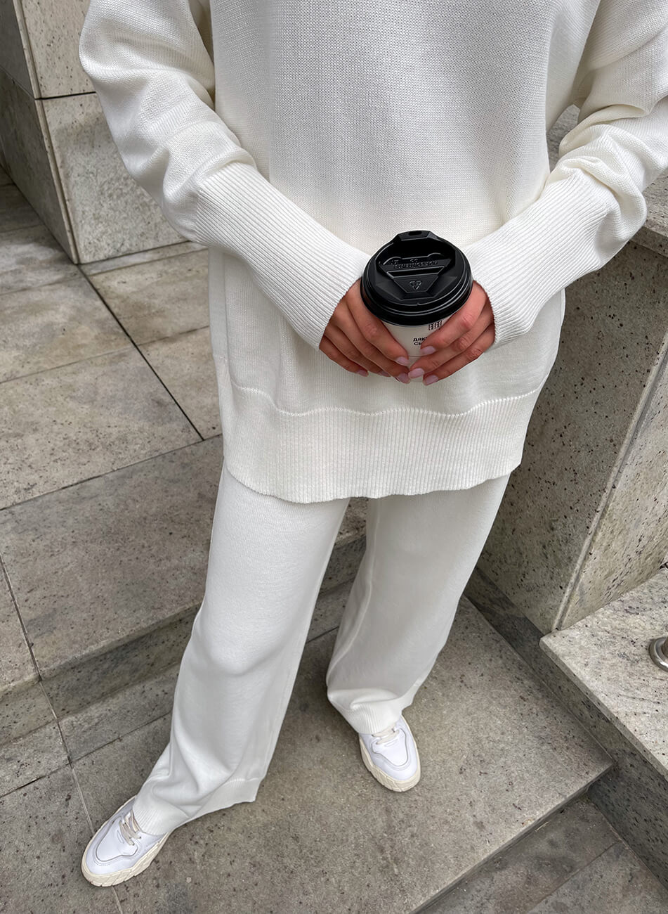 Костюм виконаний з м’якої та приємної до тіла пряжі. Широкі прямі штани, внизу імітація гумки. Светр вільного крою з високою горловиною. Манжети і нижній край вив’язані широкою гумкою, завдяки якій краї светра не розтягуються.